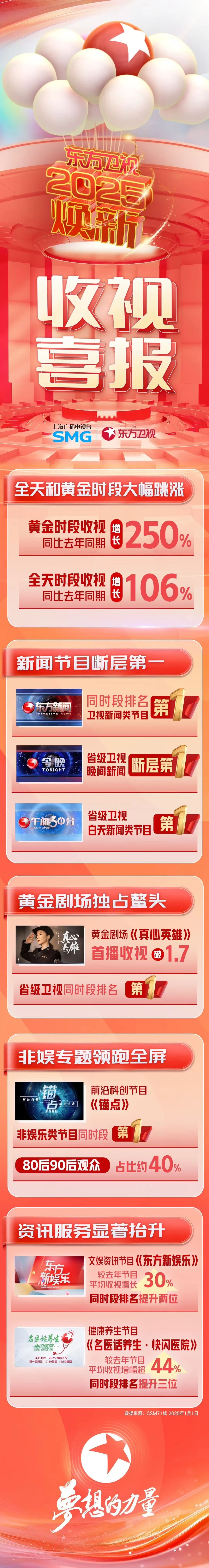 2025年,伴随着“更都市、更综合、更国际”主题定位,东方卫视全面焕新精彩亮相,进一步彰显东方气象和大台风范,擦亮“梦想的力量”媒体品牌。据CSM71城数据显示,焕新后的东方卫视全天和黄金时段收视大幅跳涨,黄金时段收视同比去年同期增长250%,全天时段收视同比去年增长106%。“广电时评”撰文,深入解读2025年东方卫视焕新背后,上海广播电视台(上海文广集团)用精品内容激荡媒体系统性变革的生动实践。