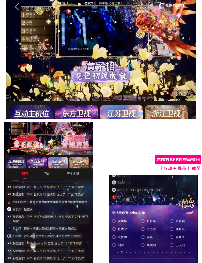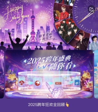 2024年12月31日晚,“梦圆东方·2025东方卫视跨年盛典”“更好2025·江苏卫视跨年演唱会”“2024-2025浙江卫视跨年晚会”“2025北京卫视跨年之夜”4台卫视跨年盛典在「互动主机位」同步呈现。在这一视角下,观众可通过投票为自己支持的那台跨年晚会争取上大屏的机会,还可尽情使用积分为自己喜爱的舞台送出祝福并进一步触发解锁超酷炫的动画特效。