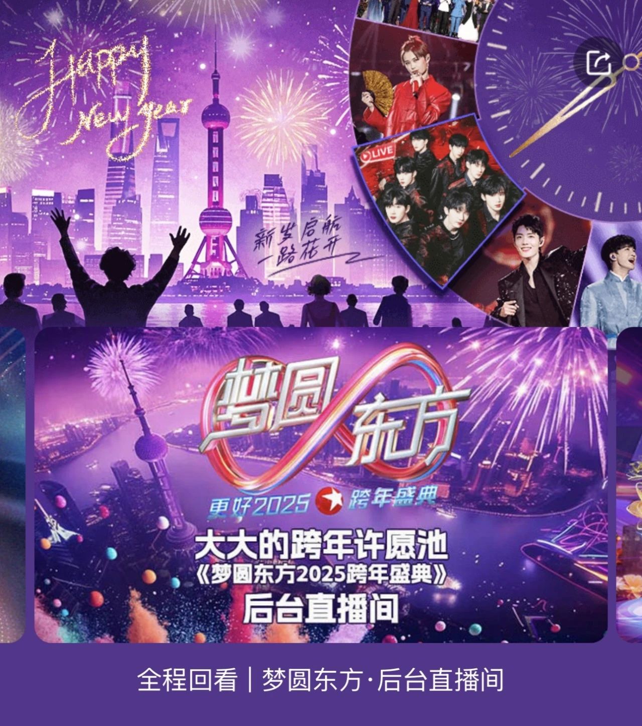 在2024年12月31日跨年当晚,《梦圆东方·2025东方卫视跨年盛典》直播期间,看东方还同步开放了晚会为观众另外开设的“后台直播间”,让观众能同步观看第二现场,玩转“跨年许愿池”,带领观众沉浸式参与跨年盛典的每一个环节!根据数据显示,跨年期间直播间累计观看人次突破1020万,短视频传播量全域破5130万。