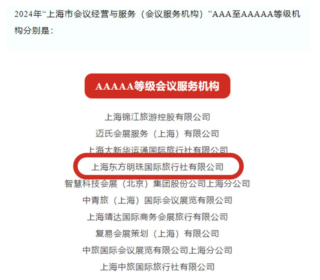 近日,东方明珠旗下上海东方明珠国际旅行社有限公司(简称“明珠国旅”)在新一批“上海市会议经营与服务(会议服务机构)”评定中脱颖而出,荣获最高荣誉AAAAA级评定,成为沪上仅有的10家5A级会议服务机构之一。