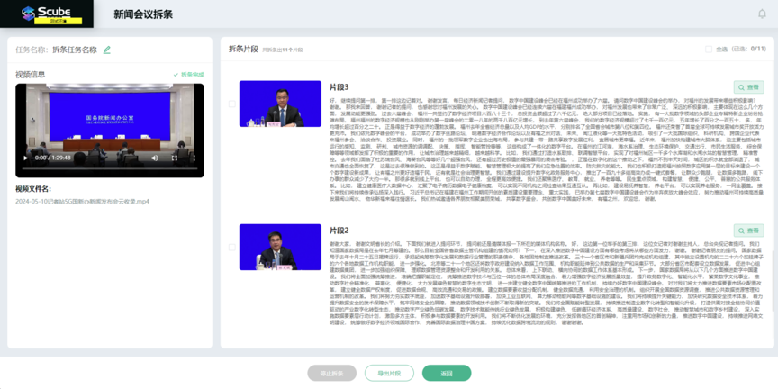 新闻会议拆条功能是指在大型新闻发布会上自动识别会议内容,完成视频内容的快速拆条,并同步生成实况文本内容。