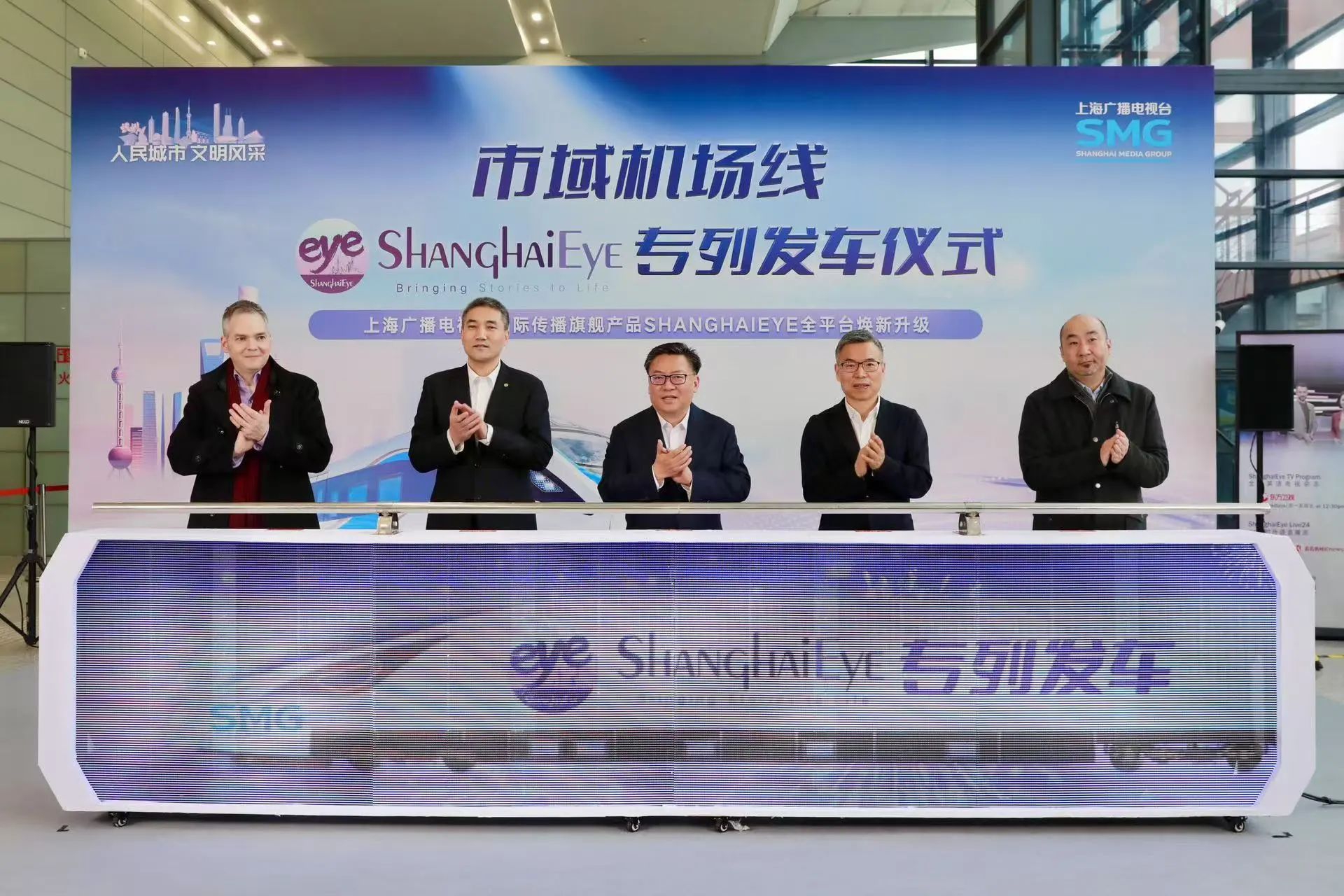 在虹桥2号航站楼,市委常委、宣传部部长赵嘉鸣,市委宣传部副部长,上海广播电视台(上海文广集团)党委书记、台长、总编辑方世忠,上海申通地铁集团党委书记、董事长毕湘利,上海广播电视台(上海文广集团)党委副书记、副台长、总裁宋炯明与上海广播电视台国际传播中心外籍专家代表共同按下启动装置,随后登上首发列车,体验“ShanghaiEye专列”的文化特色与上海速度。