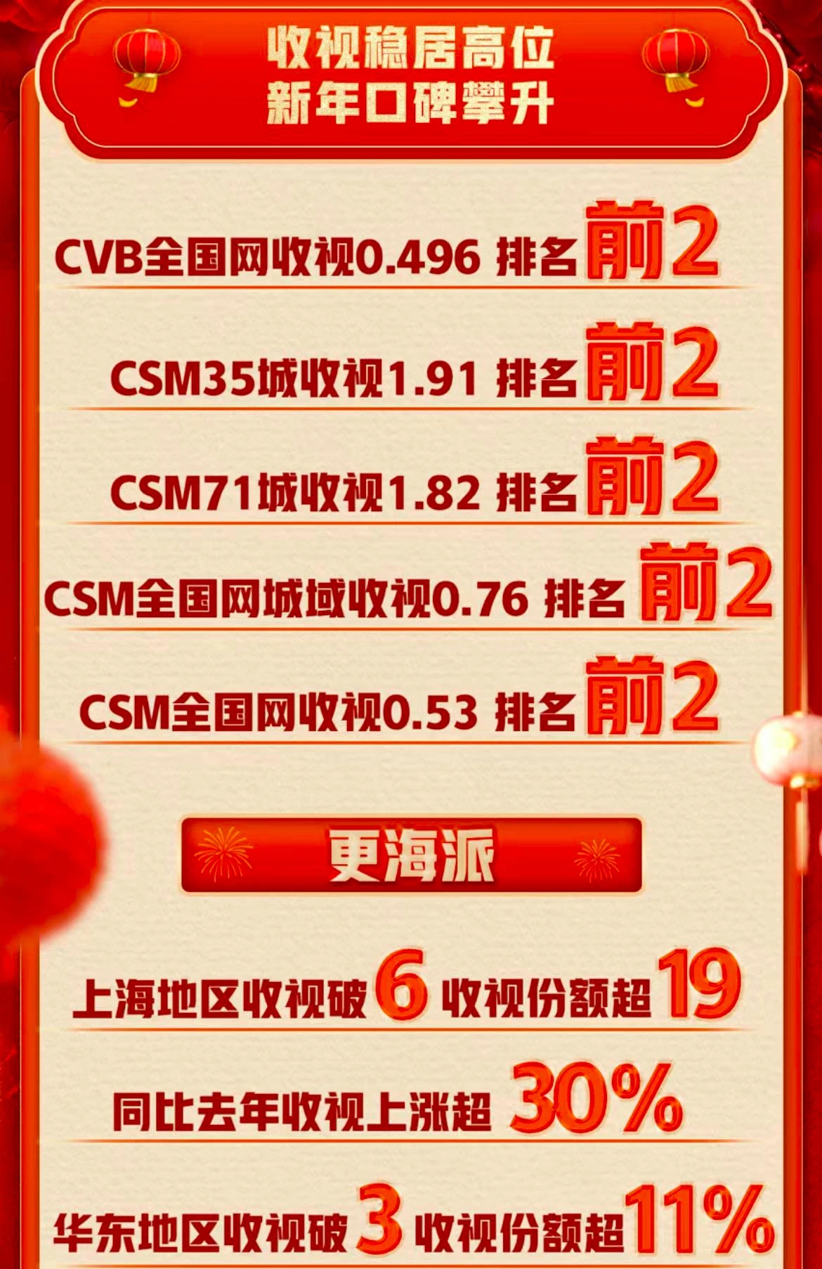东方卫视春晚播出后,强势破圈,CVB全国网收视、CSM四网收视(35城、71城、全国网城域、全国网)皆排名前2,全网热搜数量近300个,全网相关短视频总播放量近1亿。