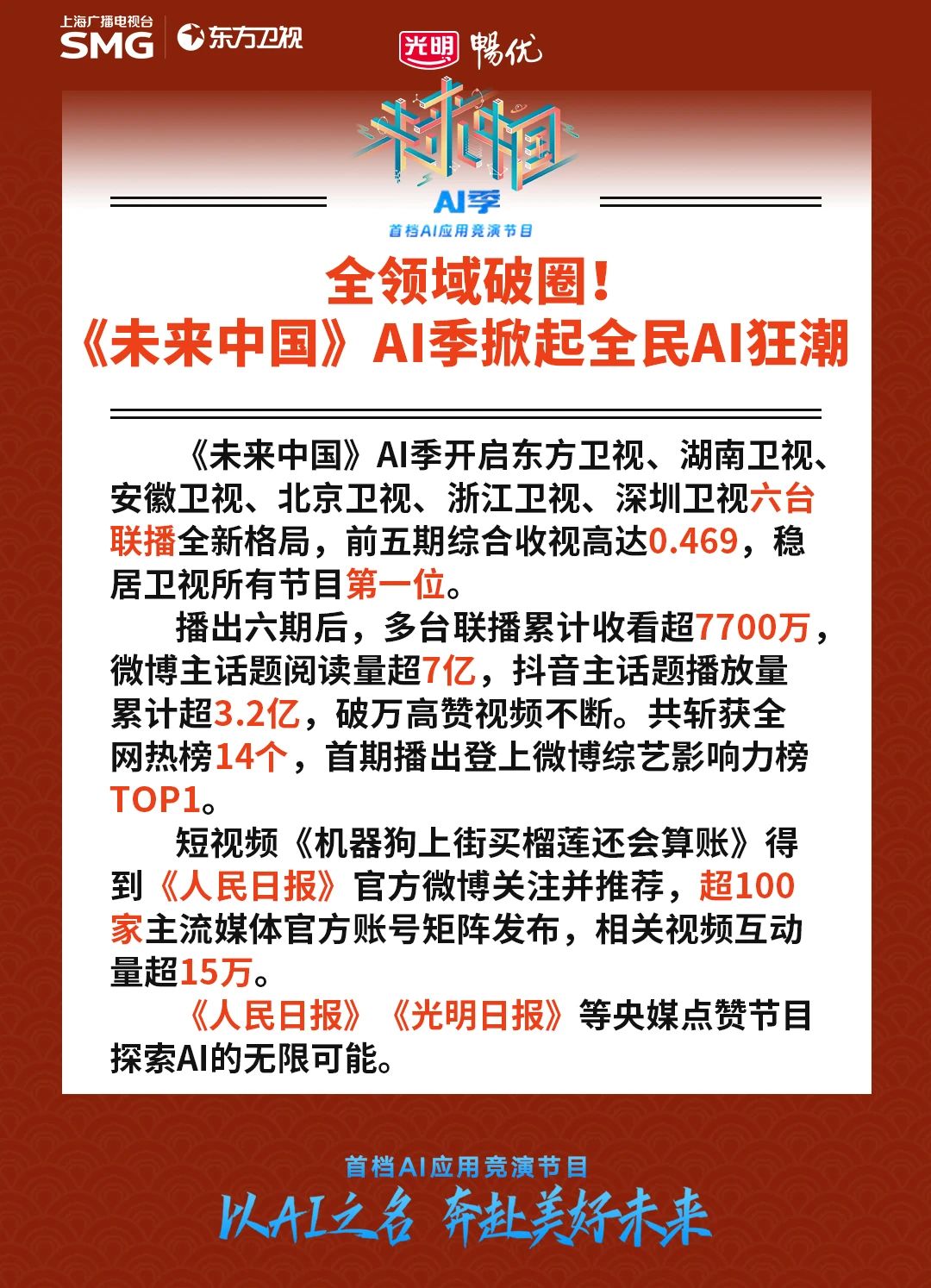 在人工智能(AI)引领全球科技变革的浪潮下,上海广播电视台已确定以“SMG in AI”为主攻方向,用AI重构媒体技术底座,于2024年12月21日推出国内首档人工智能应用科学竞演节目《未来中国》AI季,以“生成式AI创新应用”为主题,全方位展现当代中国最前沿的人工智能成果,开启国内电视节目的类型先河。