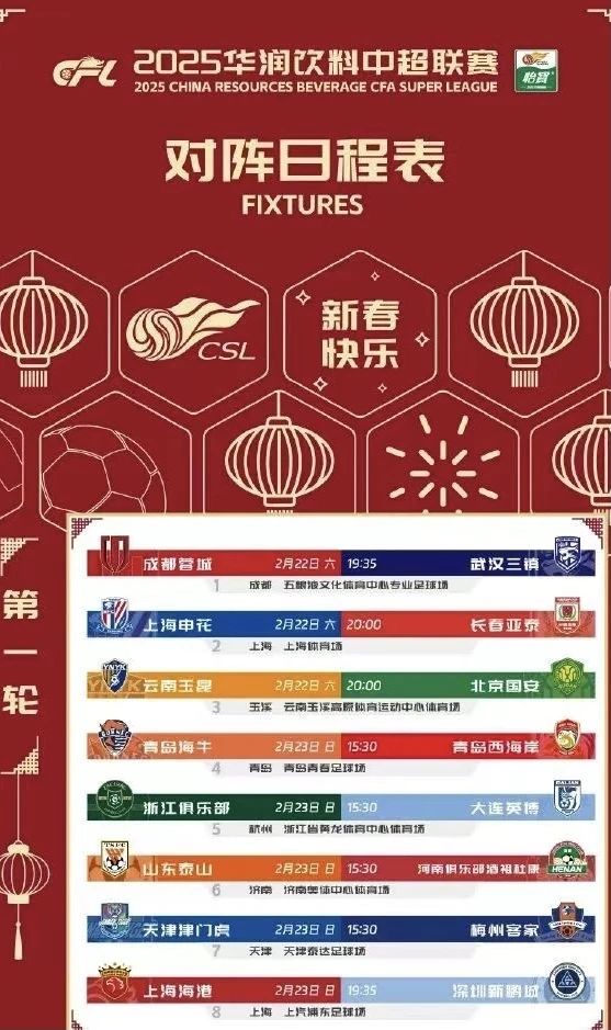 2025赛季中超联赛将于2月22日开幕,这一日期比上赛季提前了一周,刷新了中国职业足球历史上最早开赛的纪录。