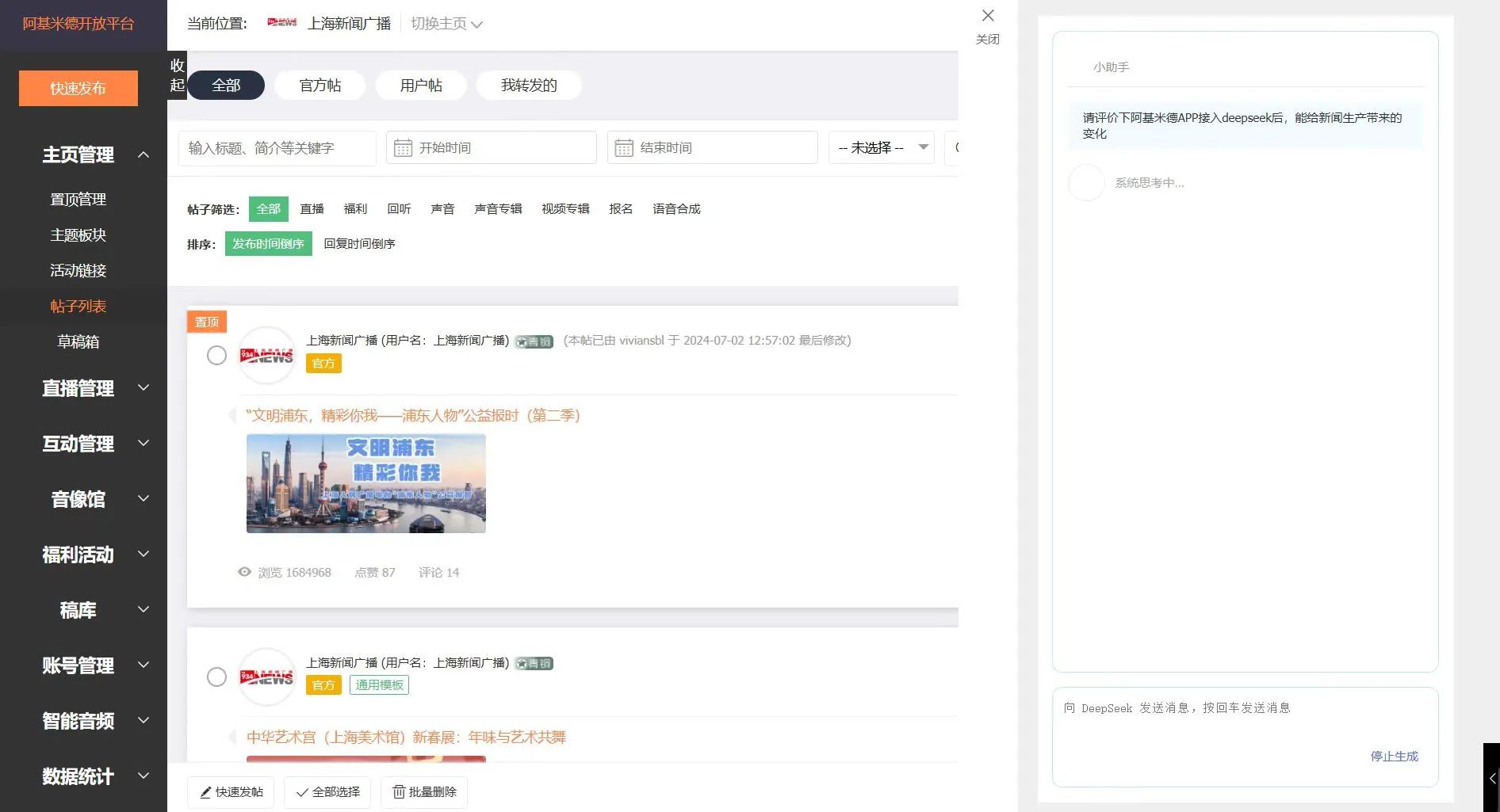 聚焦内容形态智能化创新,探索定制化产品海量生产,近日,上海广播综合音频平台阿基米德正式接入全球领先的大语言模型DeepSeek 的API端口,带来后台从内容创意到拆条生产的多维度提速。未来,用户还可接收自己喜爱内容的场景化智能推送以及更多定制化内容产品。