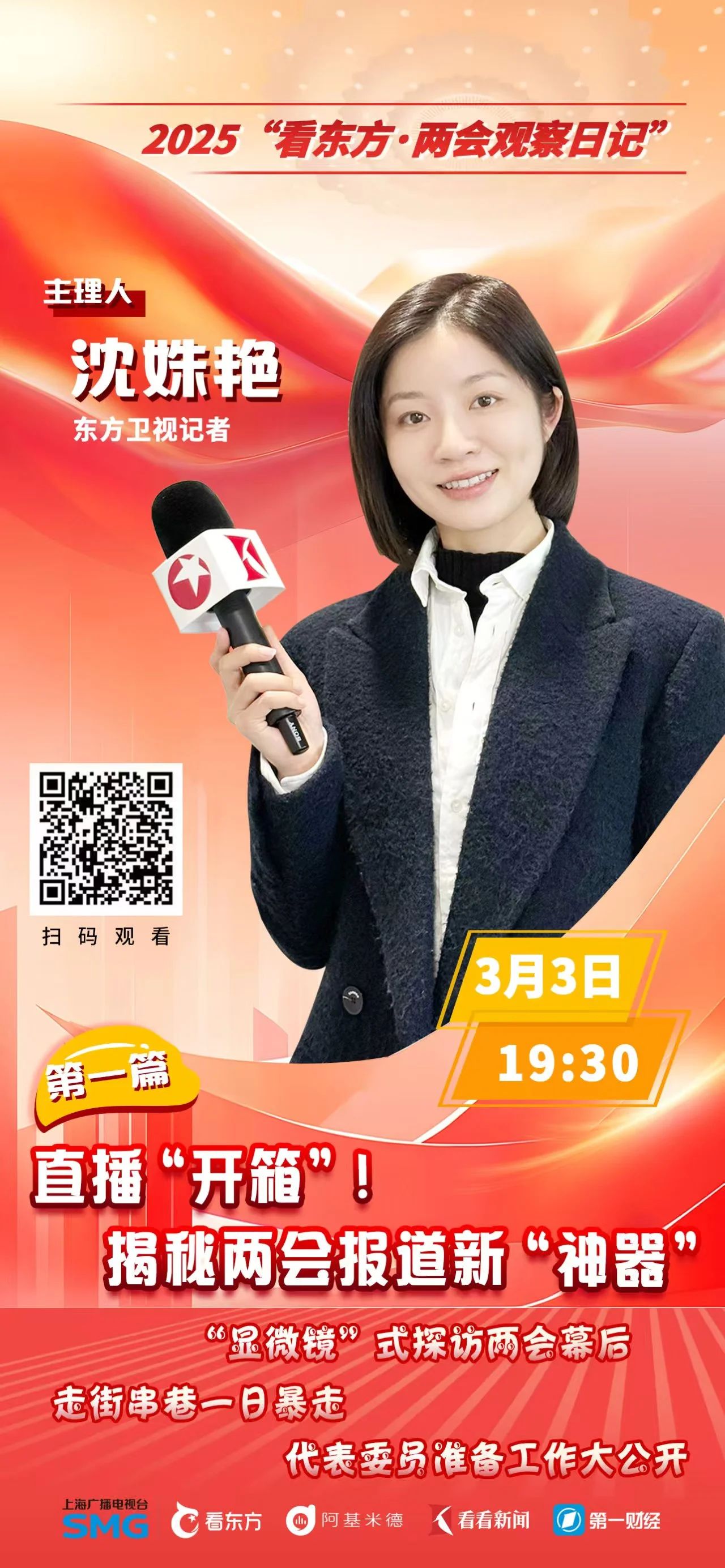世界看两会,两会看东方!2025全国两会即将启幕,上海广播电视台移动端主平台“看东方”APP于3月3日至3月11日,每晚19:30推出网络态系列轻直播“两会观察日记”。该系列直播以“一杯咖啡的时间”为独特切入点,由两会前方记者轮流担任“主理人”,讲述“有锐度、有态度、有温度、有深度”的两会故事。通过一线观察、多元视角与生动解读,让网友零距离聆听“两会好声音”,悦读“两会好内容”,进一步打响“天下大事看东方”的媒体品牌。