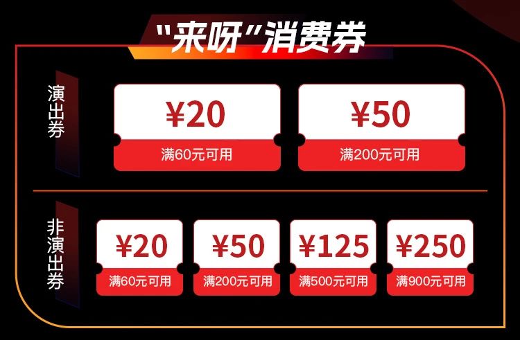 此次活动发放的“来呀”消费券分为【演出券】与【非演出券】两大类,涵盖了演出、餐饮、住宿、景点门票、休闲娱乐等50+个消费项目。