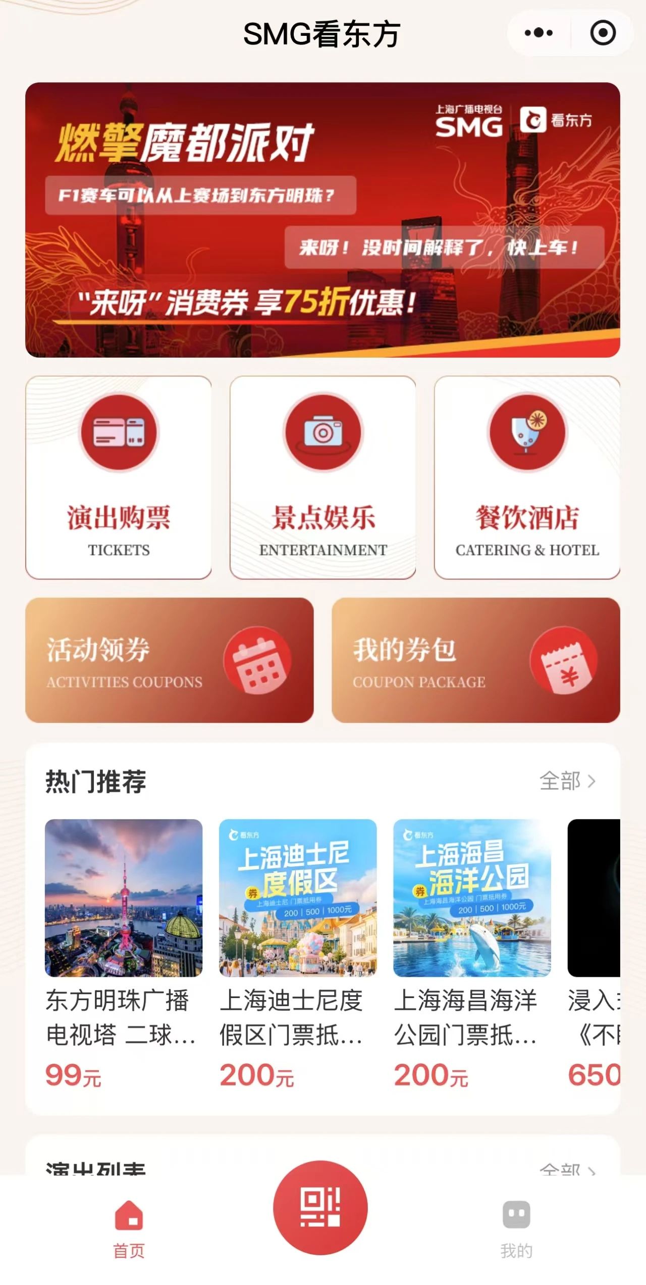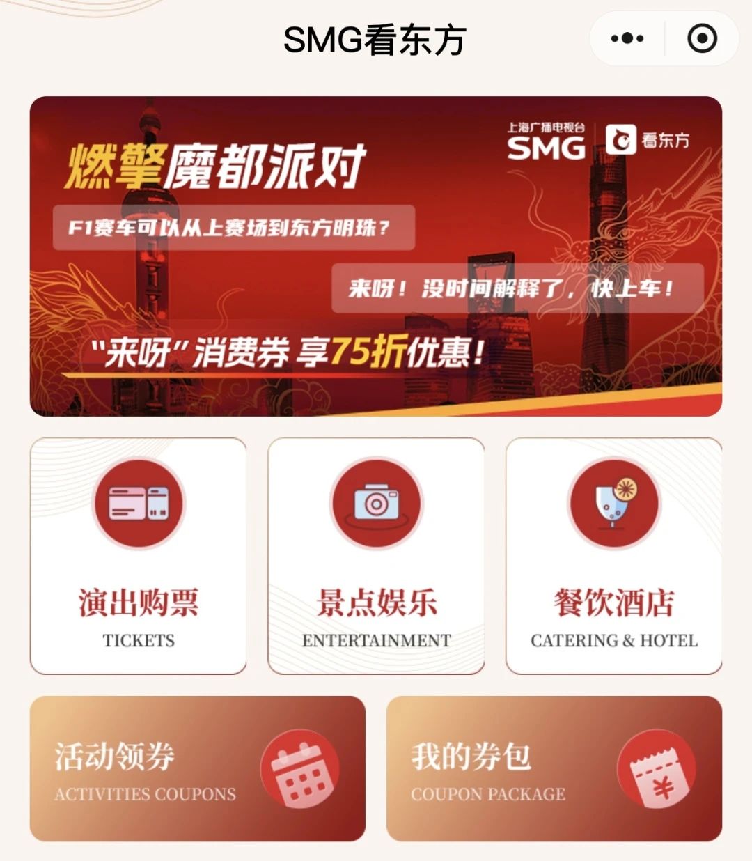 据看东方APP负责人介绍,借势F1体育盛会线上线下高能联动的热潮,SMG看东方小程序重磅推出“燃擎魔都派对”文旅商体展消费季,紧密携手东方明珠广播电视塔、上海国际会议中心等城市文旅地标,围绕演出购票、景点娱乐、餐饮酒店三大热门休闲生活场景,推出精心设计的具优惠折扣的体验产品。“看东方”将通过F1票根联动,促进F1赛事与上海4A级旅游景点、重点演出、文博展览的相互引流,提供“畅领券—享优惠—易核销”的一站式消费新体验,让便捷与实惠触手可及,让申城的消费活力在春日尽情绽放。