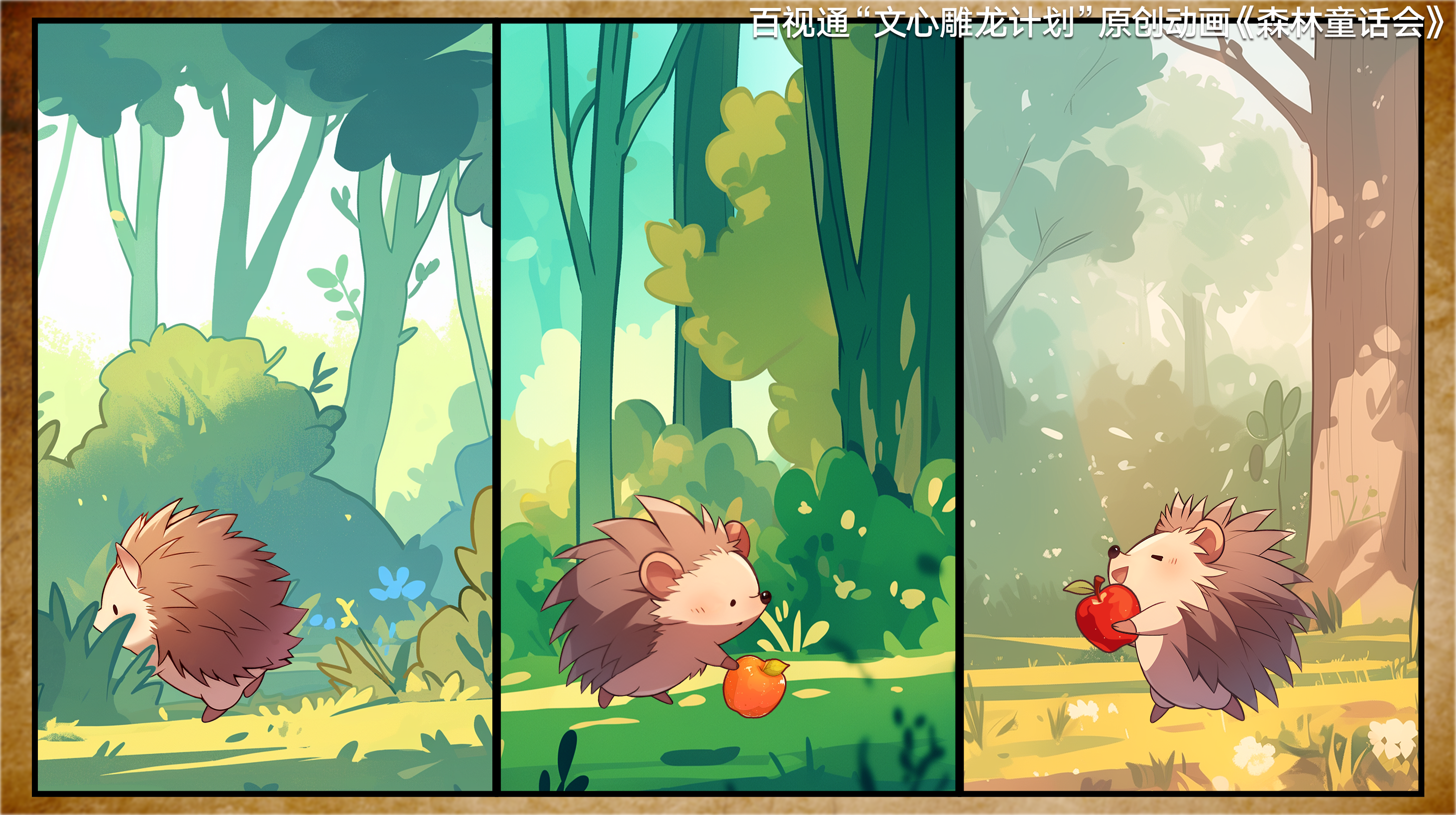 《森林童话会》共计12集,每集3.5分钟,精选《三只小猪》《坐井观天》《猴子捞月》《小鸟喝水》等经典绘本故事。借助AI技术的全程赋能,细腻的手绘风格与动态叙事完美融合,无论是满目金黄的玉米地、丁达尔效应泛着金色亮光的森林,还是月光下点缀着萤火的荷塘,都让孩子仿佛置身会动的童话书,感受身临其境的视听体验。