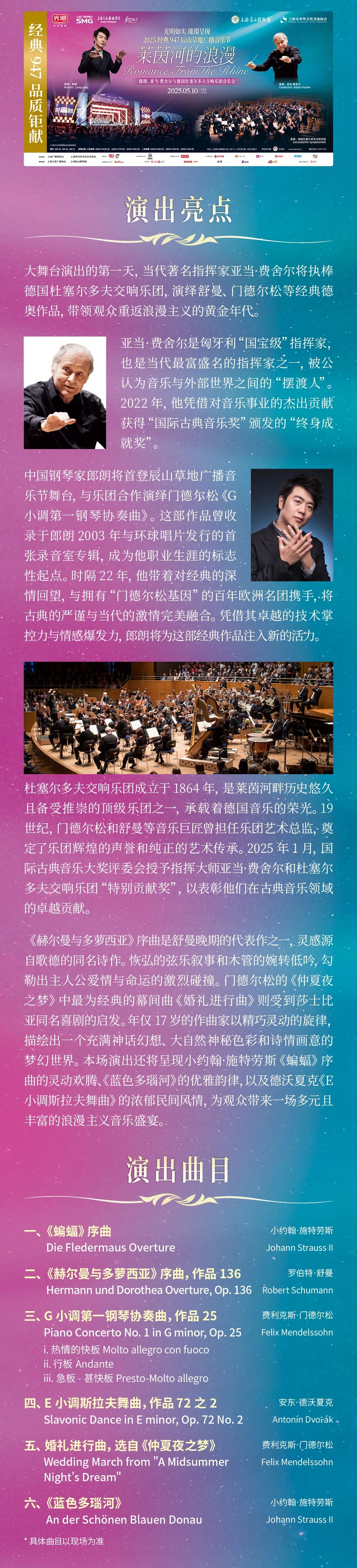 5月10日,中国著名钢琴家郎朗首登辰山草地广播音乐节舞台,将携手匈牙利“国宝级”指挥大师亚当·费舍尔,与德国百年历史的杜塞尔多夫交响乐团带来莱茵河畔纯正的德奥之声。