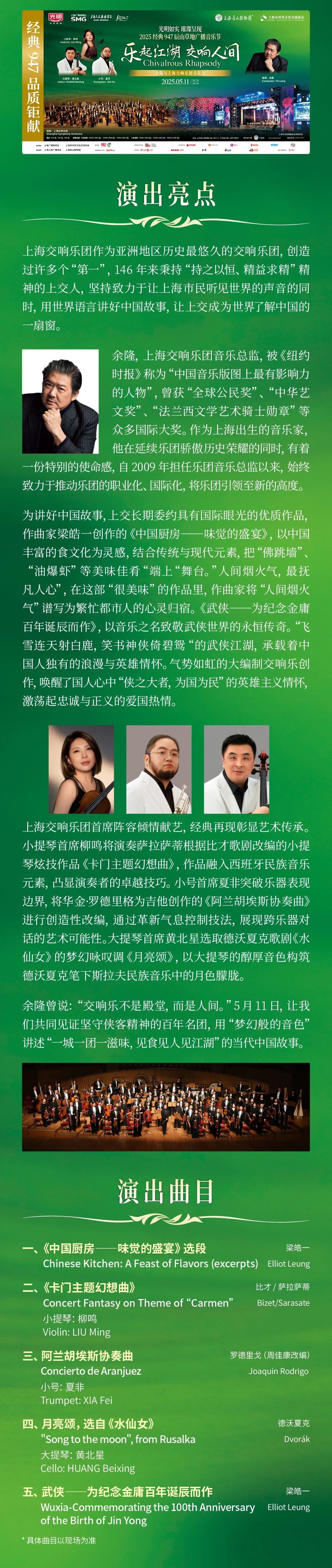 5月11日,中国著名指挥家余隆将执棒拥有146年悠久历史的上海交响乐团,用音乐诠释金庸武侠世界里的侠义柔情以及中国美食里的人间烟火气。