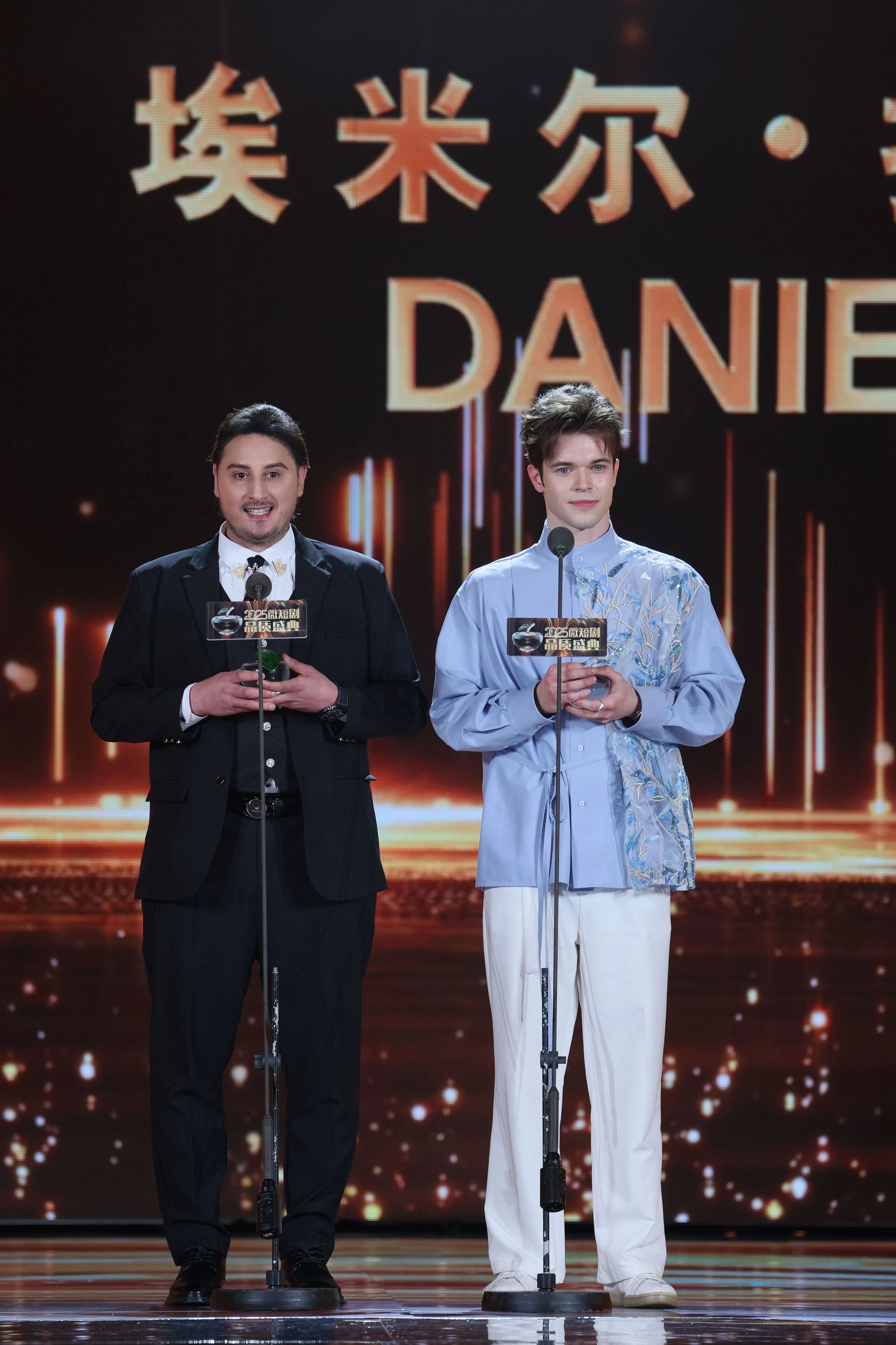 微短剧的影响力也正跨越国界,在文化交融中绽放独特魅力。本届盛典“文化传播影响力剧星”得主埃米尔·扎格鲁尔与Daniel大牛正是这场跨文化传播浪潮中的“破壁者”。因成龙电影与中国结缘的埃及青年埃米尔·扎格鲁尔,如今已参演了一系列宣传中国自然风光、展现新时代中国风貌的微短剧。Daniel大牛则参演了多部中国热播短剧的海外版本。盛典现场,他不仅精准复刻了《哪吒之魔童闹海》里“天雷滚滚我好怕怕”的片段,还与何赛飞跨界合作《上海谣》。