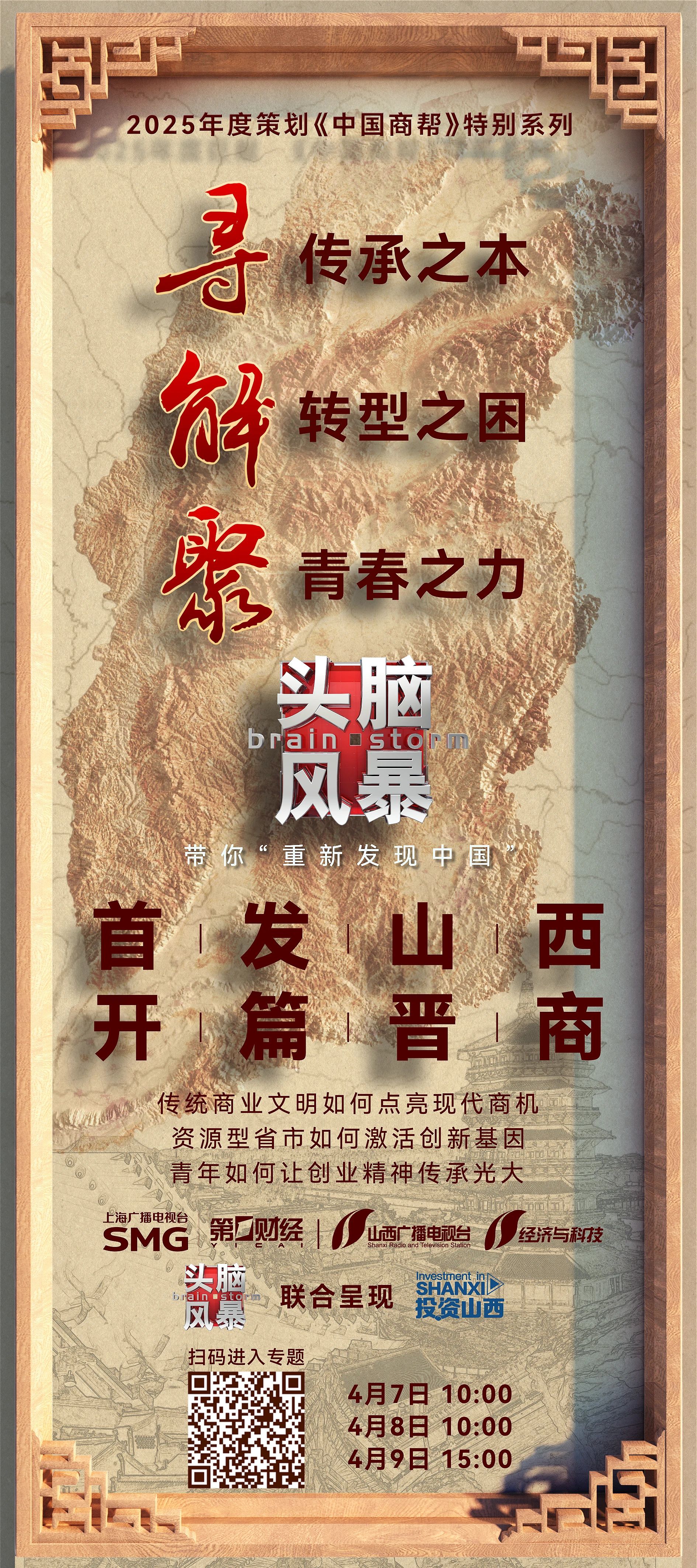 在“中国商帮之晋商篇”中,《头脑风暴》将开辟“历史纵深”与“产业前瞻”的双重解读空间;发起“寻传承之本”“解转型之困”“聚青年之力”三大硬核命题;邀请山西当地领军企业、权威专家、优秀青年创业者等共同探讨:传统商业智慧如何点亮现代商机?资源型省市如何激活创新基因?山西新青年如何开创商业新版图?