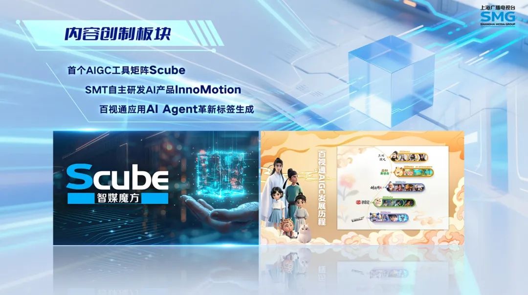 内容创制板块。去年两会期间,推出首个AIGC工具矩阵Scube(智媒魔方),集合多种AI能力,涵盖智能剪辑、全语种翻译等模块,大幅提升新闻“采编播存发”效率。巴黎奥运会期间,上海东方传媒技术有限公司(SMT)自主研发的AI产品首次应用于乒乓球和射箭赛事的国际公共信号制作。百视通应用AI Agent技术,实现介质流转效率提升超30%,图片设计效率提升15%。