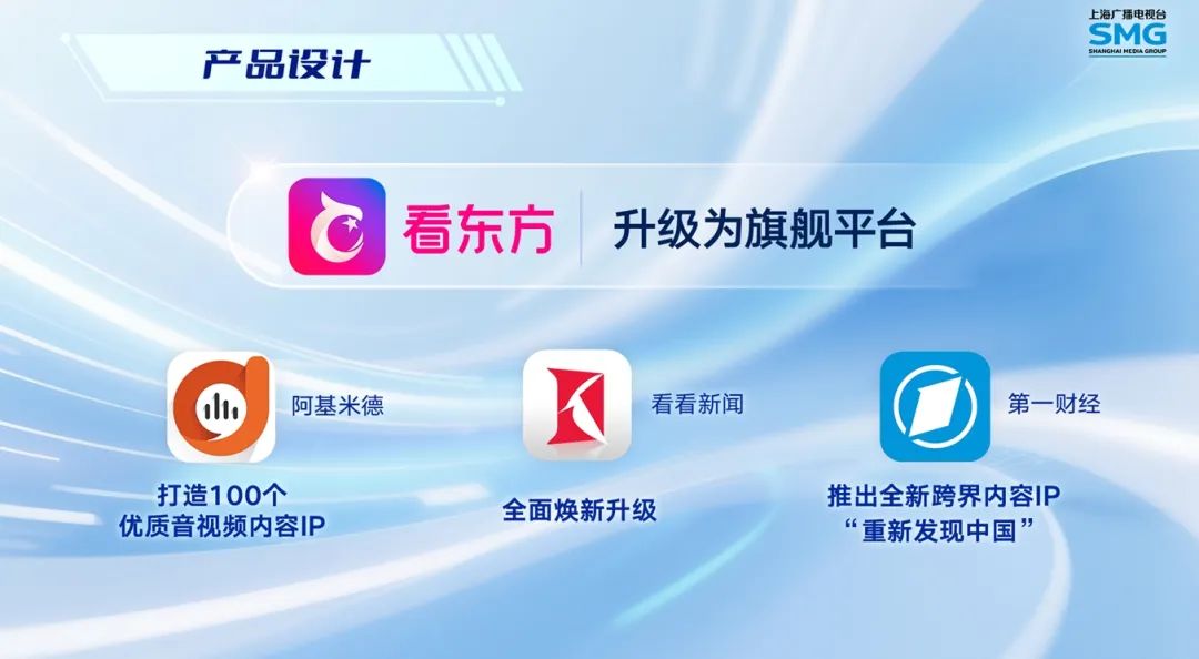 在产品设计方面。不断增强用户意识和市场意识,打造“1+3”移动端产品矩阵。把“看东方”升级为旗舰平台;“阿基米德”打造100个优质音视频内容IP;“看看新闻”全面焕新升级;“第一财经”推出全新跨界内容IP“重新发现中国”;让高质量的APP产品成为商业变现的重要载体。