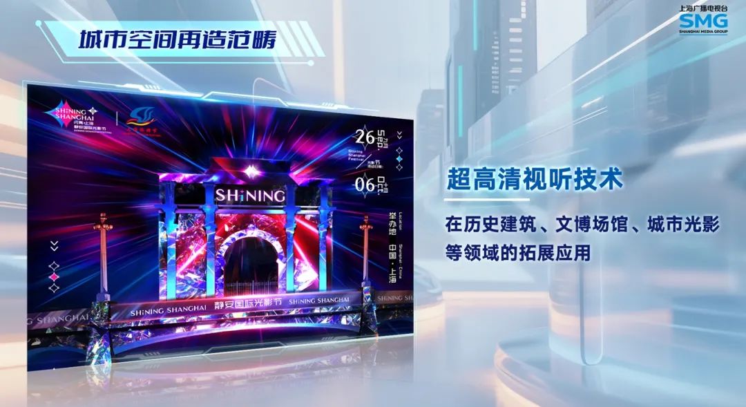在城市空间再造范畴。探索超高清视听技术在历史建筑、文博场馆、城市光影等领域的拓展应用。比如上海国际光影节,将超高清技术与数字艺术结合,在城市地标呈现Mapping投影作品,提升城市形象,带动周边消费。