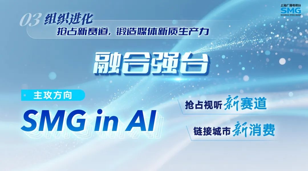 组织进化是第三向度,我们把“融合强台”作为鼎新之钥。布局“SMG in AI”主攻方向,锻造新质生产力,抢占视听新赛道,链接城市新消费,激发科技新势能,引领主流媒体高质量发展。