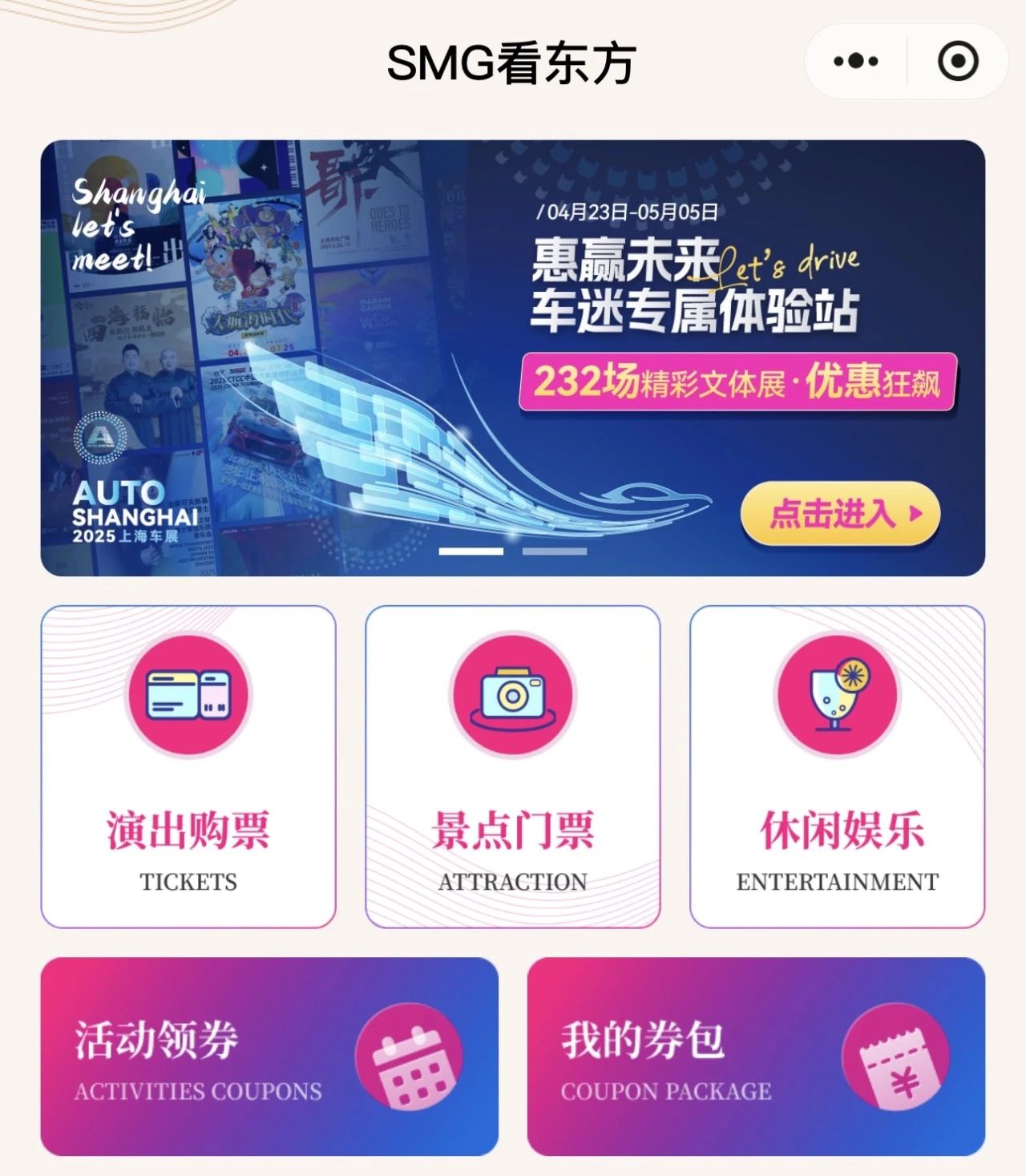 作为上海广播电视台倾力打造的移动端综合视频主平台,看东方“魔都圈”文旅商体展消费季充分挖掘票根经济效应,通过在SMG看东方小程序发放消费券并精心设计联动产品的方式推进落地拉动二次消费。此次与国内三大综合一级票务平台之一「票星球」联手打造的车展全品类演出平台“惠赢未来-车迷观演体验站”囊括了200多个车展周期将在沪上发生的文体展活动。