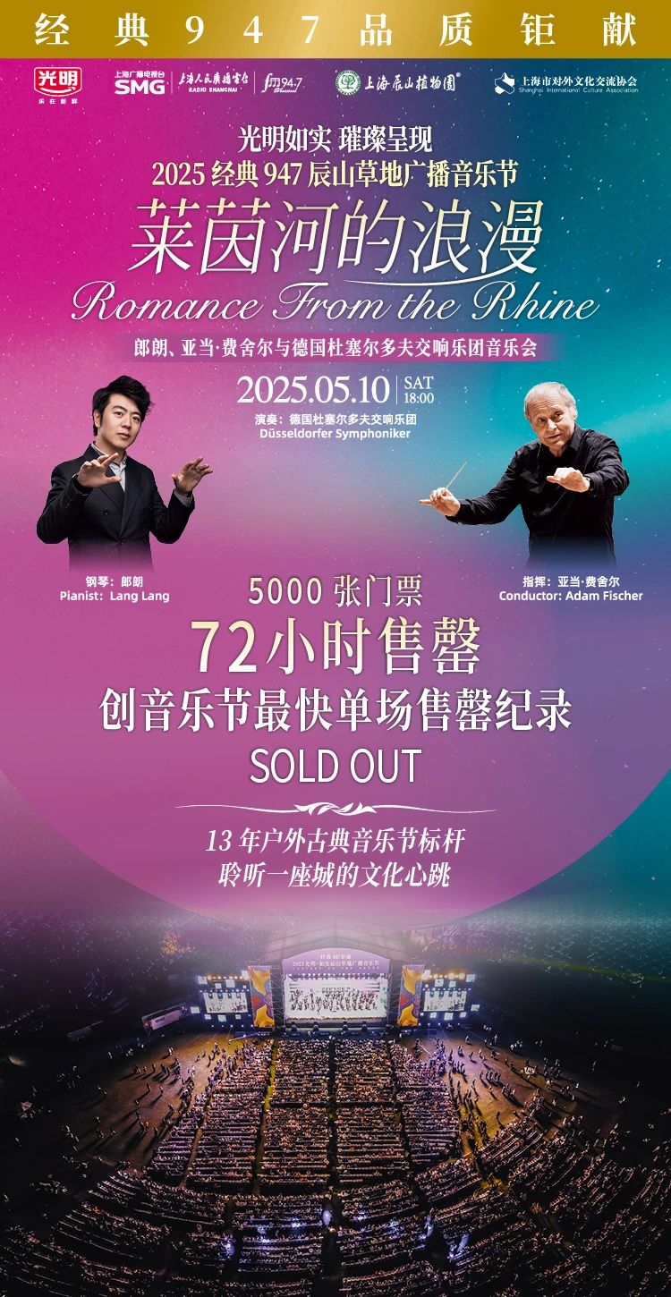 凭借卓越的演奏技巧与深厚的音乐素养,在国际舞台上大放异彩的郎朗,成为闪耀全球的中国名片。此次登上辰山草地广播音乐节的舞台,成为他在国内户外大型古典音乐节上的首秀。5000张演出门票在开票72小时内即告售罄,创下辰山音乐节最快单场售罄纪录。