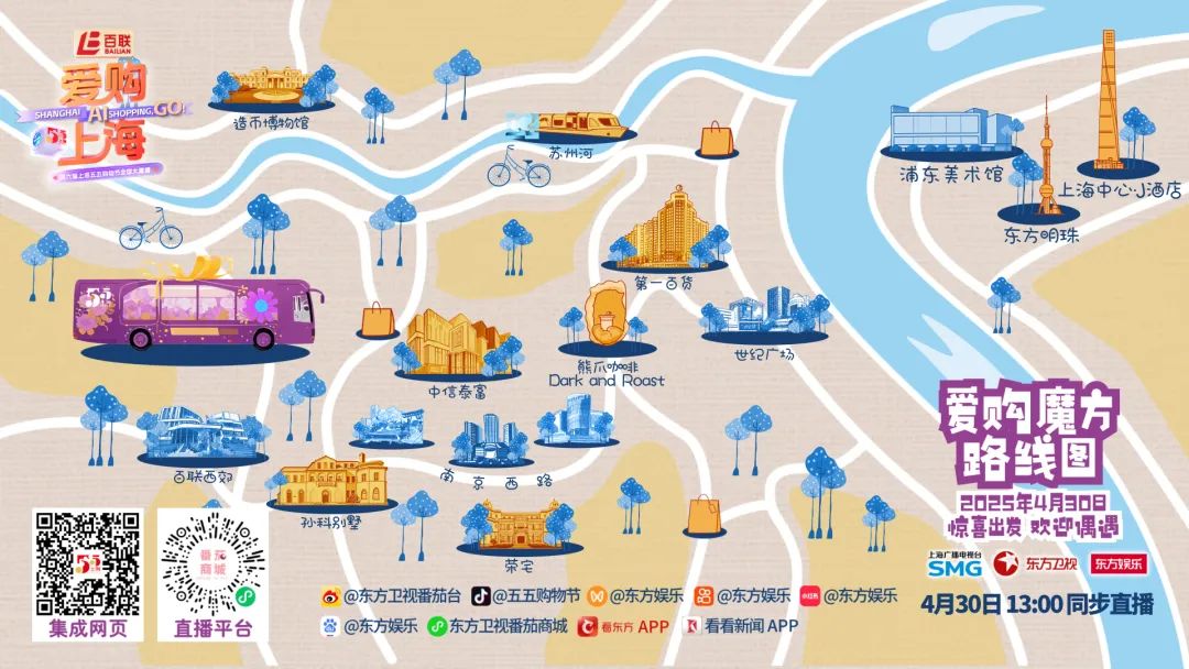 在以往“大屏+小屏”的联动直播之上,今年首创将小屏直播间搬出录影棚,迁入移动直播车——爱购魔方,同步在上海各个地标增设地标直播间——白玉兰直播间:在东方明珠、上海造币博物馆、西郊国际农产品交易市场3个地标开启直播接力,全城流动,停车不停购。