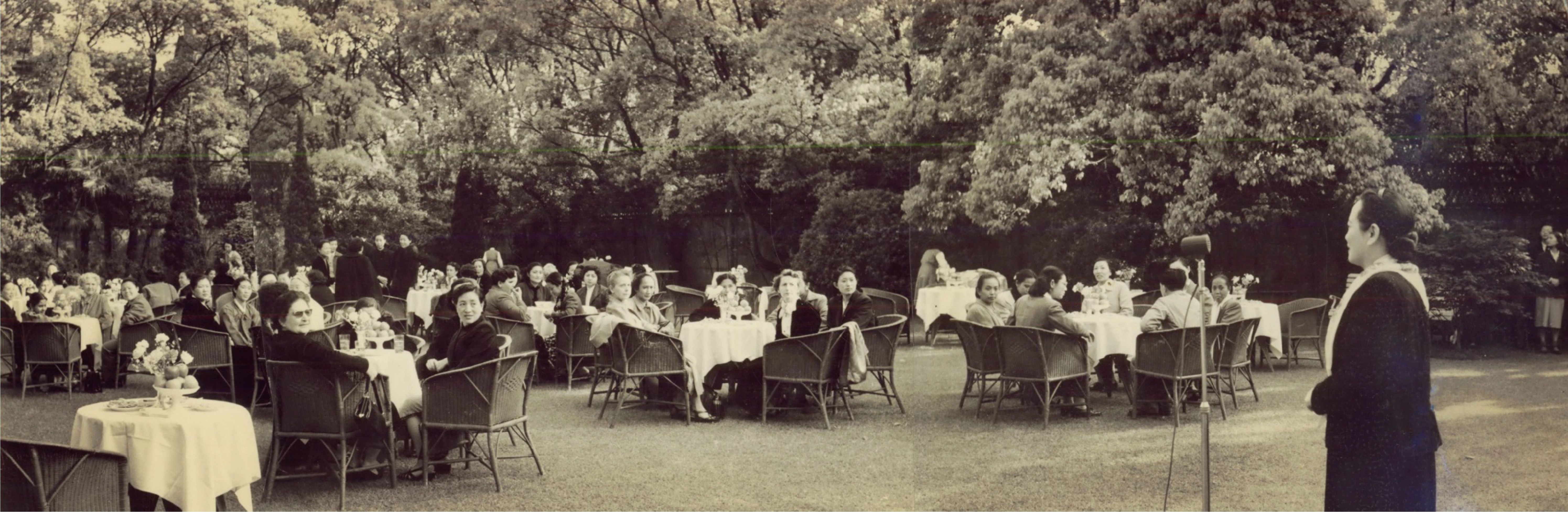 1956年5月11日,宋庆龄在上海寓所花园招待出席国际民主妇女联合会理事会的24国妇女代表