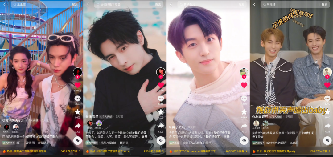 作为SMG首档互动直播歌会,《我们好极了歌会》锚定Z世代群体,以“听劝”“活人”“情绪价值”为标签,从传播策略到内容策划全面浸润年轻态社交语境。前期宣发阶段,推出一人一梗的定制化方案,从“音效宇宙”“跨次元互动”“反差合拍”“特效ID”等官宣物料,到“高低音灵感菇”“笑声唱baby”“自问自答版跳楼机”等创意视频,均获得较高点赞量、转发量,黄明昊王玉雯姬芽摇、蒲熠星金宣虎微笑、黄子弘凡变装转场等多条爆款视频成功出圈,成功激活年轻圈层社交裂变传播链。