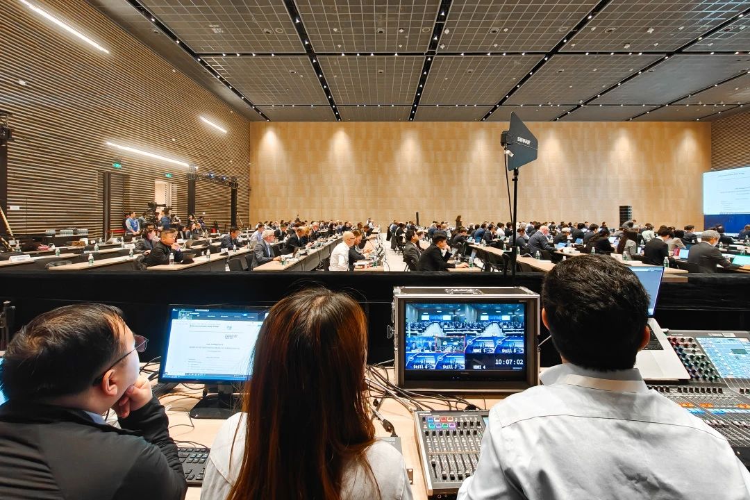 本次会议最大技术亮点之一便在于要实现多维度、跨平台的实时联动。一方面,线下会场议程频繁调整,讨论议题常常临时增补,分会场快速启用、设备灵活调度成为常态。与此同时,线上需同步承接全球一百多个成员国的远程接入需求,网络环境复杂,语言系统多样且需要实现远程发言、同步投屏、音视频交互等高复杂度技术支持。