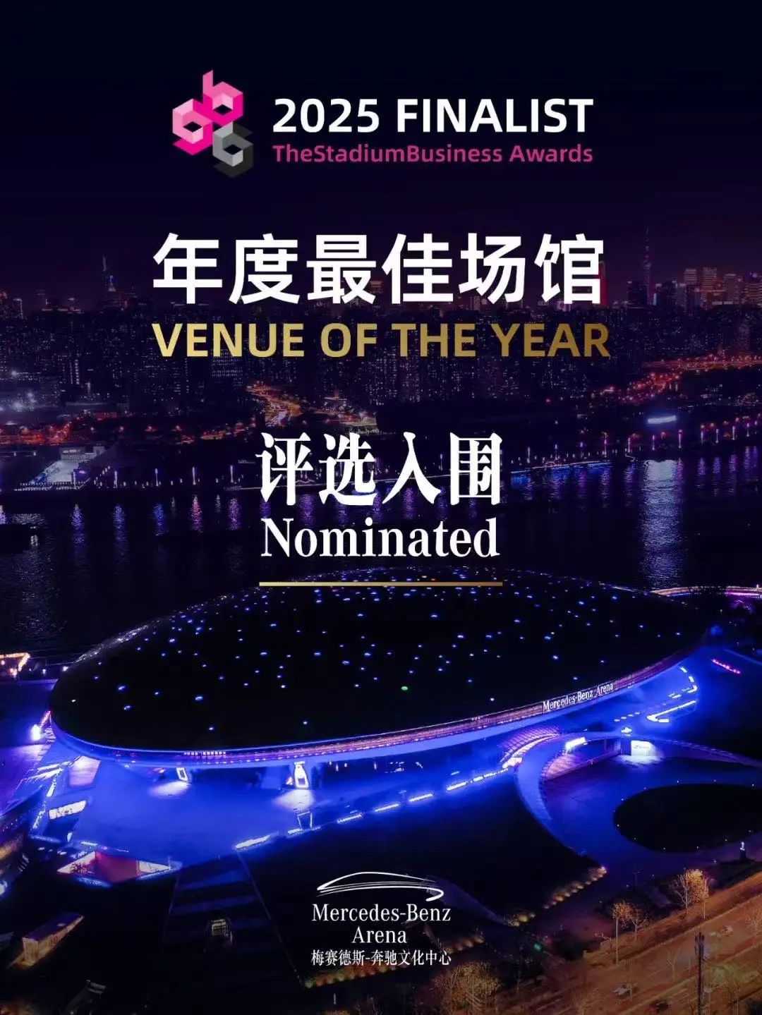 The StadiumBusiness Awards (体育场及场馆行业奖项)于2010年在英国创立,是全球首个、也是唯一聚焦体育场及场馆行业运营与管理的国际奖项,旨在表彰体育场及场馆在运营与管理领域的卓越领导能力、创新实践以及取得的显著成就,评选结果具有广泛的国际影响力。经过严格的全球征集和评审筛选,全球共有8个场馆入围2025“年度最佳场馆”,包括中国上海梅赛德斯-奔驰文化中心、新加坡国家体育场、英国Co-op Live、香港启德体育园、德国德意志银行体育场(法兰克福体育场)、美国Crypto.com场馆、美国英图伊特体育馆及瑞典Strawberry场馆。