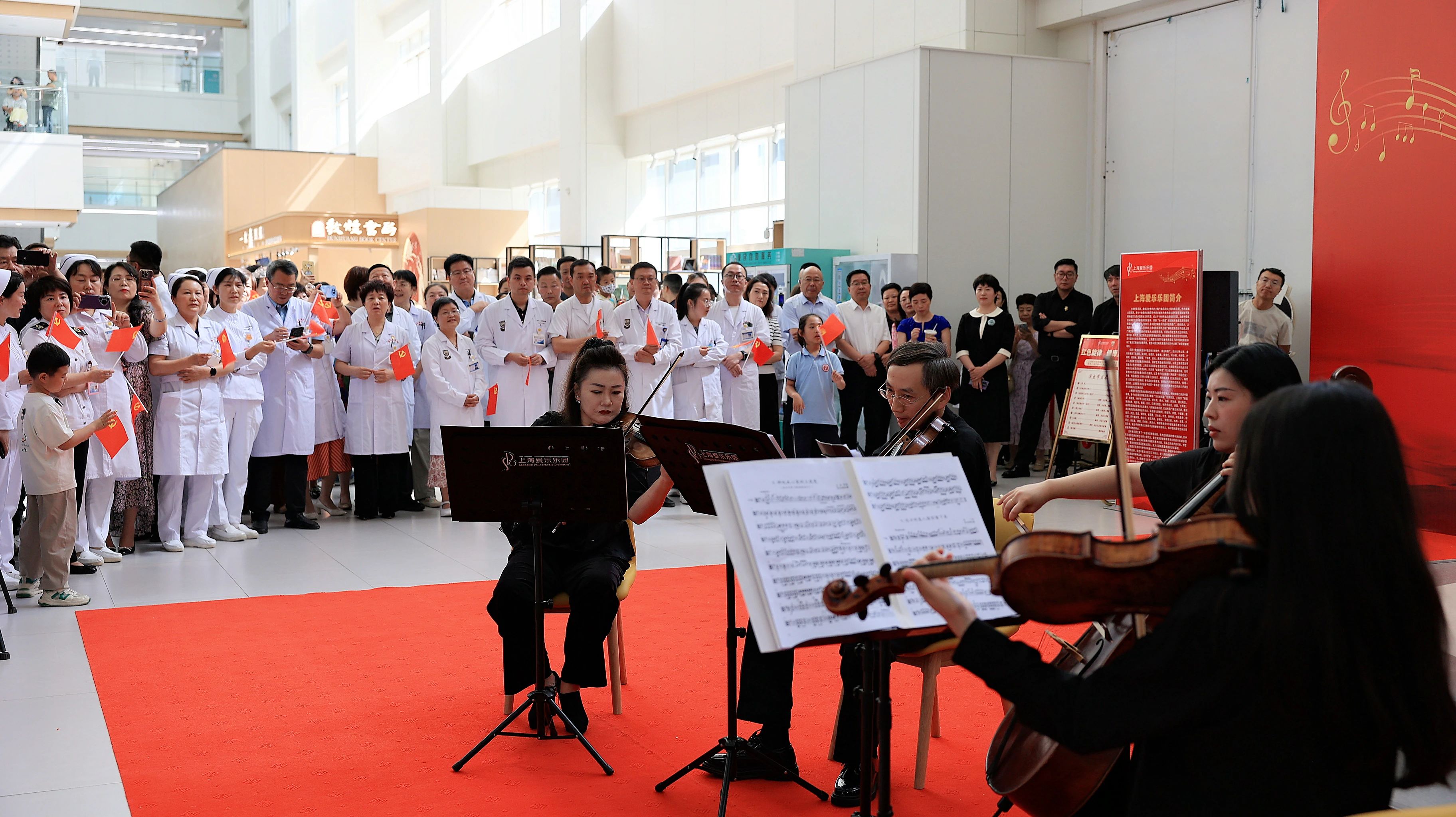 6月26日一大早,上海市第一人民医院酒泉医院的大厅里,弦乐四重奏悄然响起。演奏家们带来吕其明《弹起我心爱的土琵琶》《城南旧事》,施光南《在希望的田野上》,朱践耳《唱支山歌给党听》等作品以及加演曲《我和我的祖国》,引发现场医护人员和患者的大合唱。