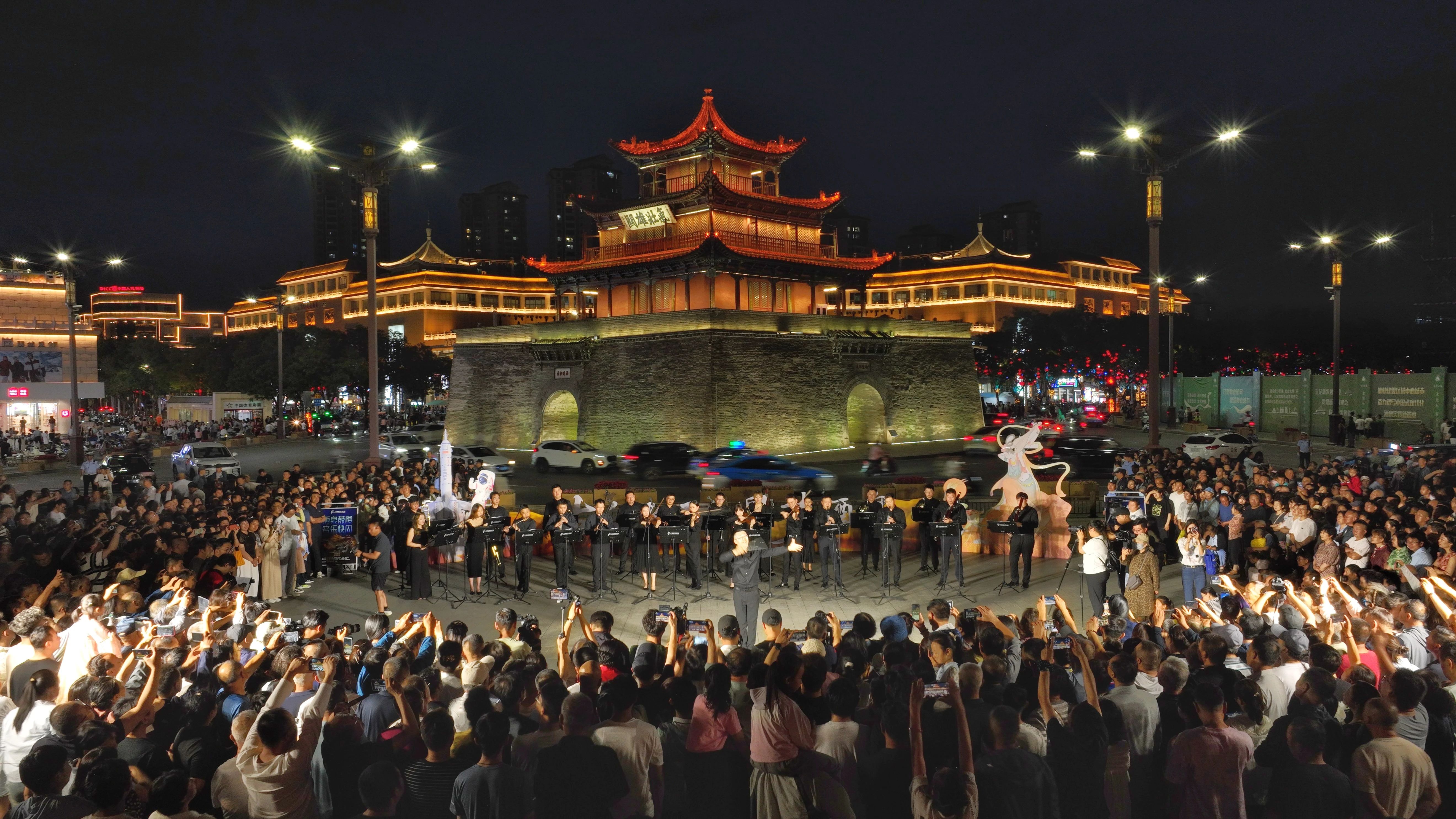 6月25日晚21时,酒泉鼓楼前响起了《上海滩》的旋律,引路人纷纷驻足。快闪活动现场,演奏家们带来《上海爱乐号角》、1986版《西游记》片头曲《云宫迅音》以及《黄土高坡》。热情的当地观众,合着乐声唱起了《上海滩》《黄土高坡》,并在演出结束时意犹未尽地高喊“再来一曲”。还有观众激动地说,“演得好!上海的音乐家辛苦了!”