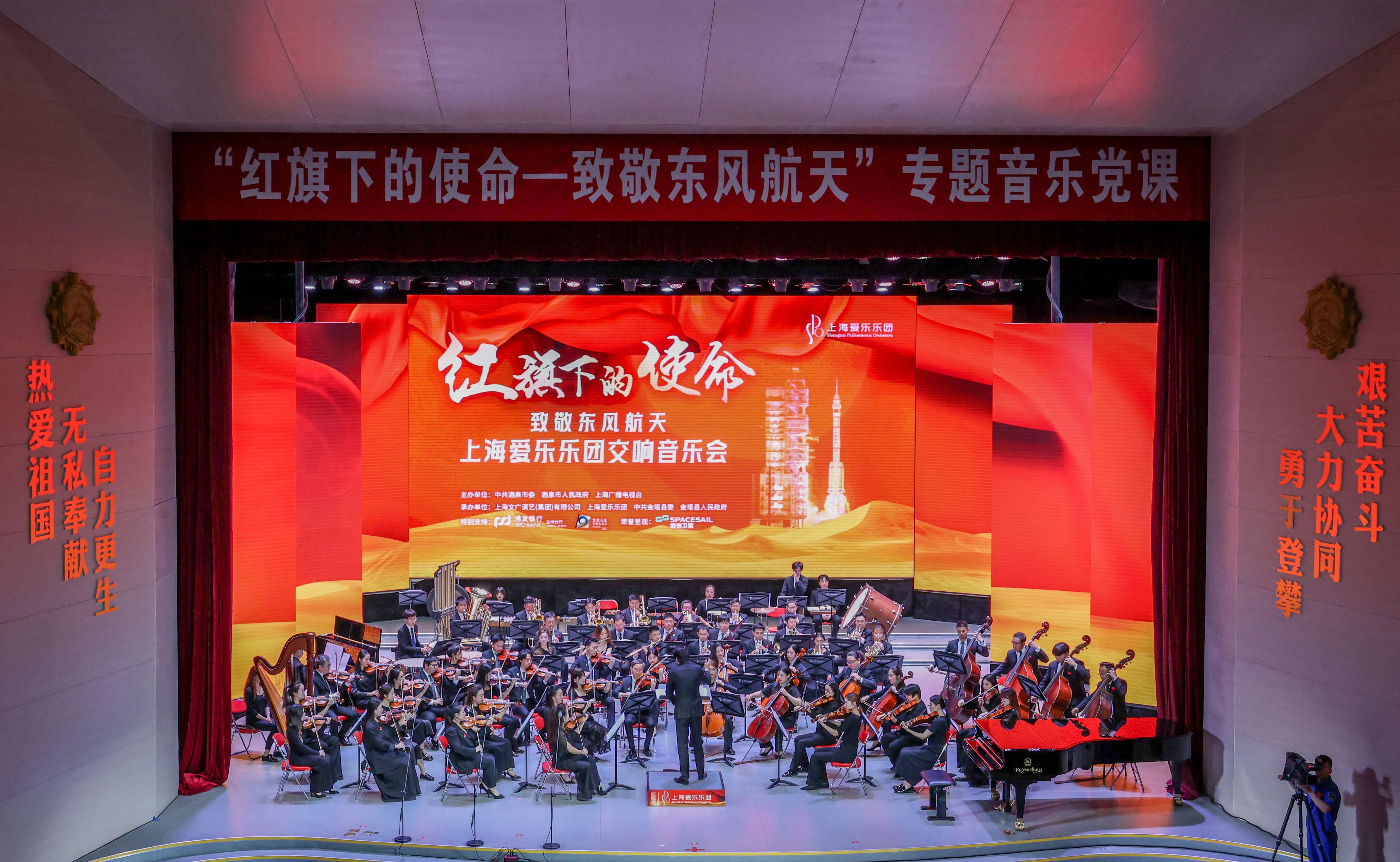 音乐会上,上海爱乐乐团奏响了吕其明管弦乐序曲《红旗颂》60周年纪念版。95岁高龄的作曲家吕其明专门发来视频,“我用音乐歌颂红旗,而你们让红旗精神绽放光芒。祝中国的航天事业在党的领导下蒸蒸日上,创造更多的中国奇迹。”