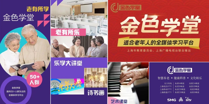 联合上海市教育委员会,打造50+全媒体终身教育平台“金色学堂”。“金色学堂”设置24小时“健康科普、智慧养老、文化娱乐”三大节目带,通过覆盖上海地区有线电视、百视通IPTV等渠道,打造集学习咨询、课程学习、交流互动、平台展示、体验活动于一体的空中社区,获教育部“特别受百姓喜爱的终身学习品牌项目”“智慧助老”优秀工作案例等荣誉。