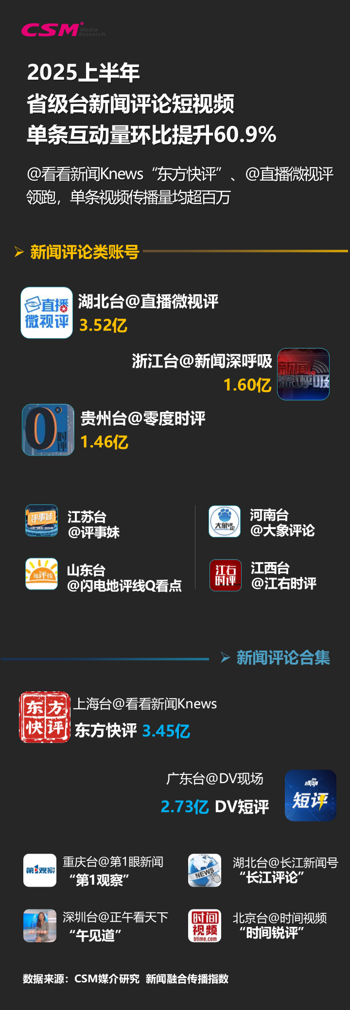 加强新闻评论建设,专业深度内容有效引流,新闻评论短视频传播力提升。@看看新闻Knews《东方快评》聚焦时政评论,上半年揽获超3.5亿传播量,单条视频传播量均超120万,领先省级台评论类合集传播。针对美国对等关税议题,发布系列短视频,累计传播量超23亿;其中,“104%的关税是否落地?我们怎么应对?中方起码准备了6招”传播量超过9400万。聚焦“印巴冲突升级”,相关主题网络直播总观看人次超1263.6万,流量位列省级台同题报道首位。