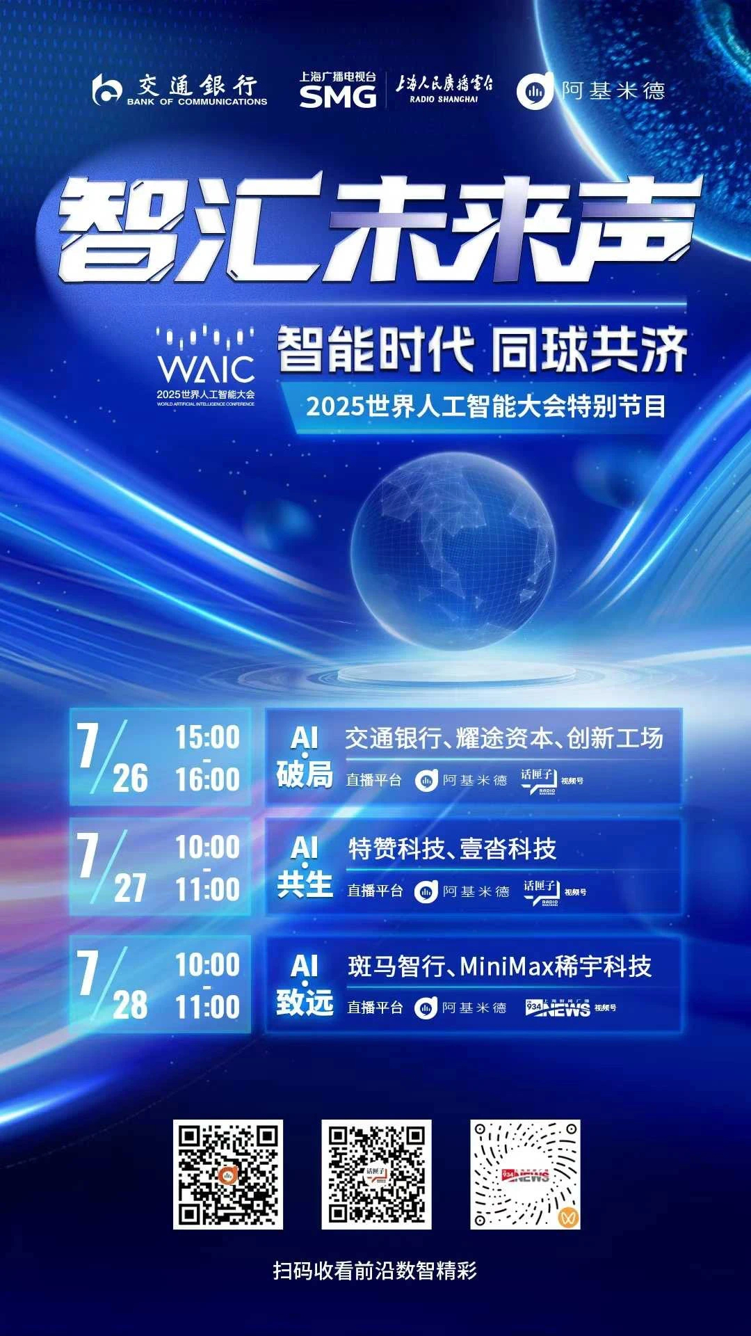 第一财经作为2025世界人工智能大会战略合作媒体,全程提供高质量的工作支持与服务保障,负责大会开、闭幕式运营管理、策划及落地执行等,承办大会主论坛、人工智能精英夜话及AI+医健产业可持续创新论坛,同时承制“3×24小时全程大放送”。