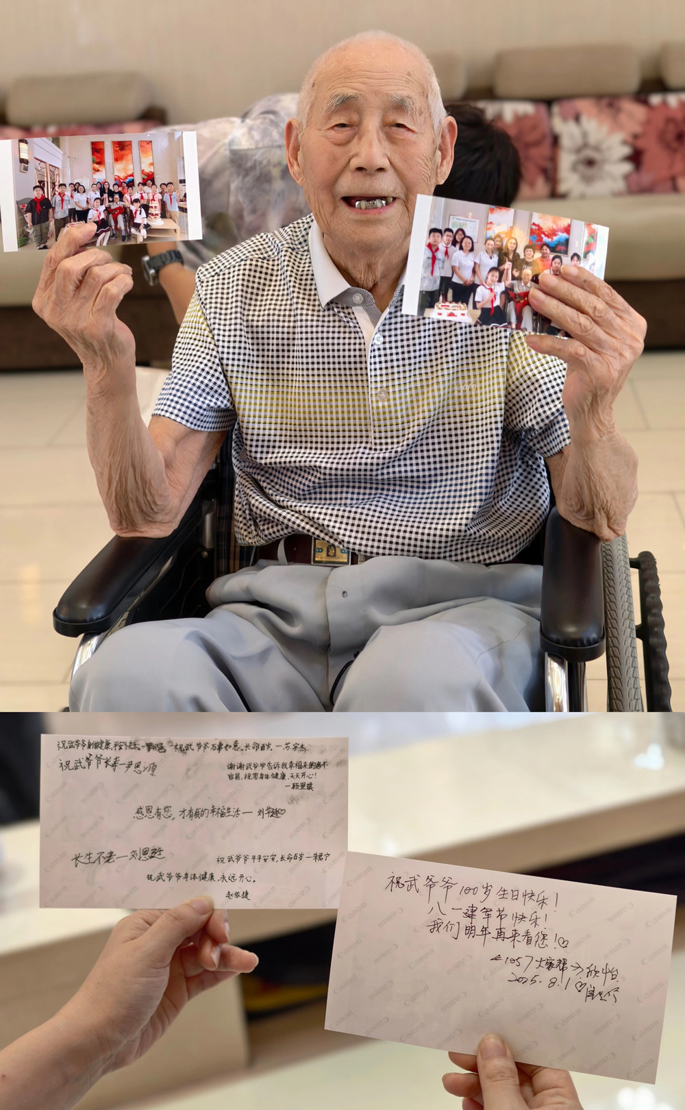 去年孩子们离开时,武爷爷坚持让护工推着轮椅送到大门口,直到车队拐弯还在挥手;而今年,孩子们特意把合影打印出来,在背面空白处写下满满的签名和祝福:“武爷爷,101岁再见!”