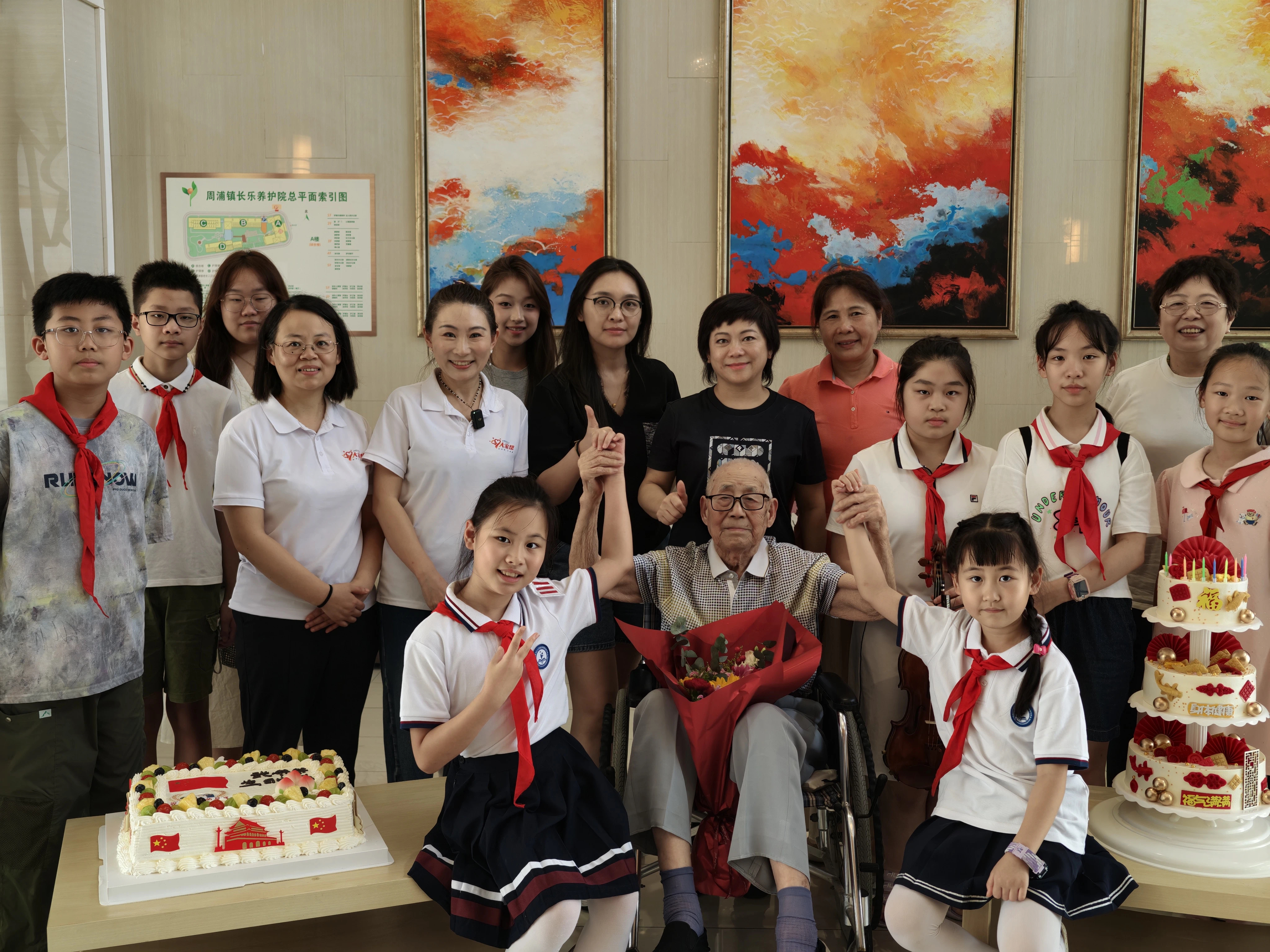 一年后的今天,在中国人民抗日战争暨世界反法西斯战争胜利80周年即将到来之际,孩子们如约而至。建军节的荣光、百岁寿辰的喜悦与抗战胜利纪念的庄严,在这个夏日的敬老院里交织出一幅动人的画卷。三个重要时刻的完美重合,给这个生日赋予了非凡的意义。