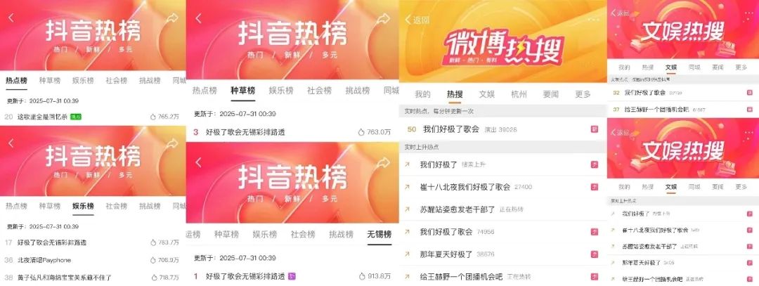 《我们好极了歌会》第二期直播间人均看播时长 4.99min,创节目播出纪录。截至7月30日21:00,#这歌里全是回忆杀、#好极了歌会无锡彩排路透等相关话题强势“霸榜”,全网全平台累计上榜48次,歌会热度持续飙升。