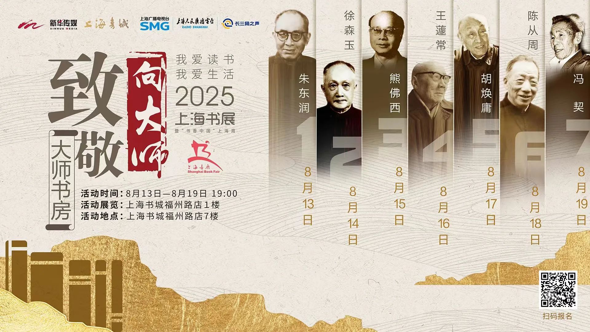 2025上海书展期间,上海人民广播电台长三角之声携手上海新华传媒,将在书展主场之一的上海书城推出“向大师致敬”主题展暨“大师书房”全场景播客。第一季向徐森玉、朱东润、王蘧常、熊佛西、胡焕庸、冯契、陈从周(按生年为序)等七位社科大师致敬。