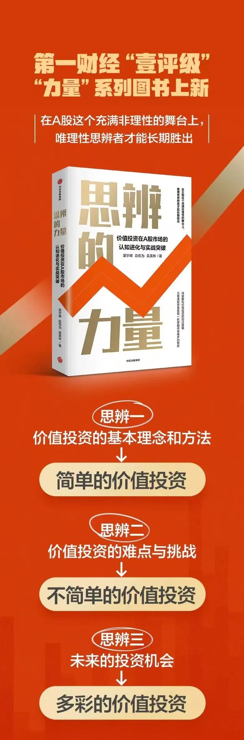 8月16日,第一财经将联合中信出版社为图书《思辨的力量》举办题为“思辨价值投资,思辨机会与风险”的新书分享会。本书源于第一财经《价值三人行》数百期电视节目的内容精华,集中展示了对中国资本市场的长期观察和深度思考、对价值投资理念和方法论的辩证分析。同时,《思辨的力量》也是第一财经全新推出的“壹评级——专业股票评价体系”的理论基础之一。本书联名作者之一、上海壹评信息总经理梁宇峰将携资深投资人凌鹏一起,围绕新书创作背景和理念展开对话,深度剖析中国资本市场未来十年的财富机遇与风险。