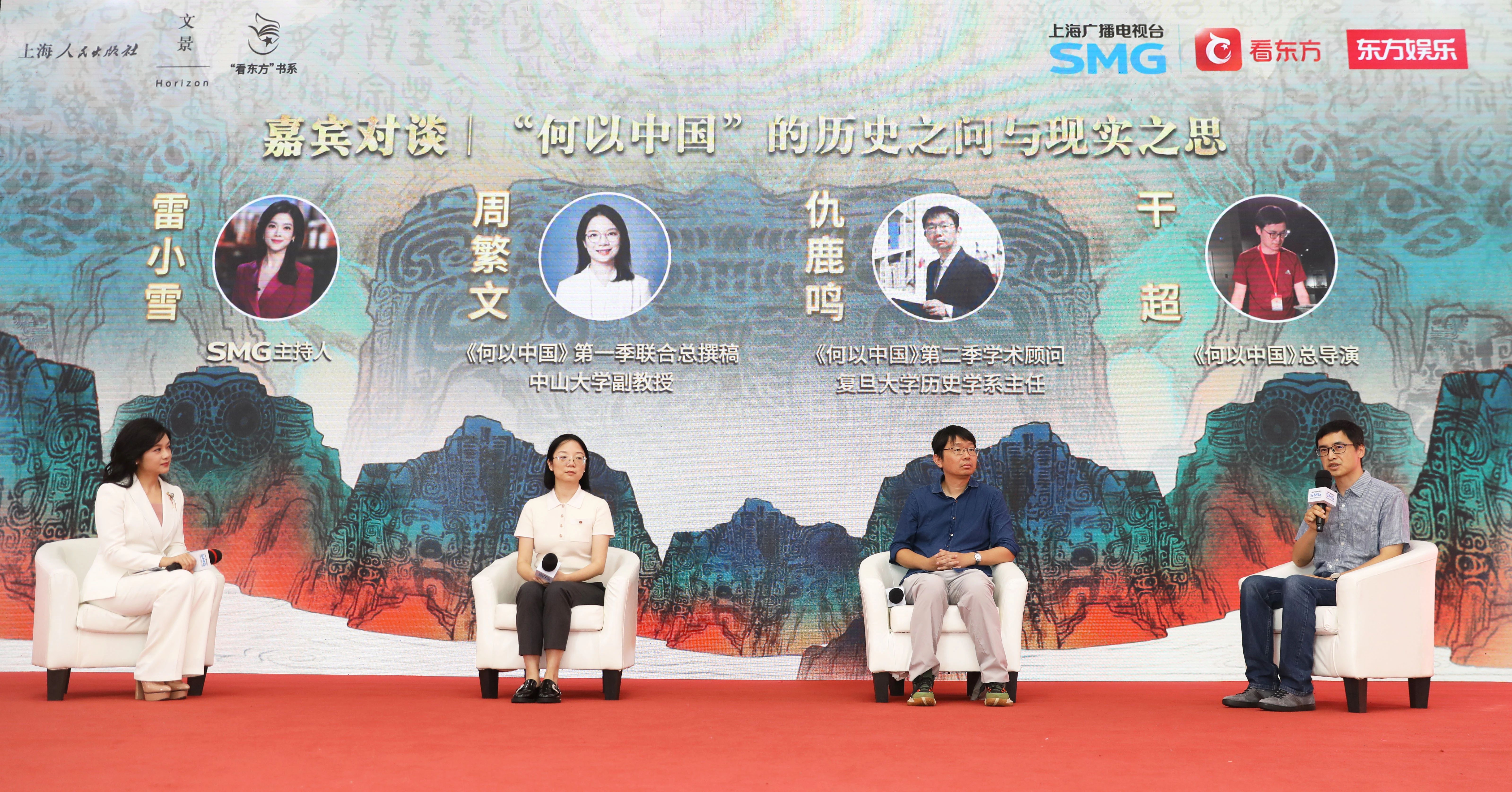 现场,《何以中国》第二季学术顾问、复旦大学历史学系主任仇鹿鸣,《何以中国》第一季联合总撰稿人、《何以中国:考古里的万年中国史》图书主笔、中山大学社会学与人类学学院副教授周繁文,《何以中国》总导演干超就“‘何以中国’的历史之问与现实之思”这一话题展开对谈。