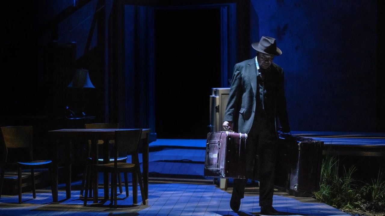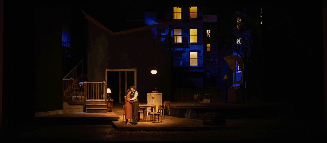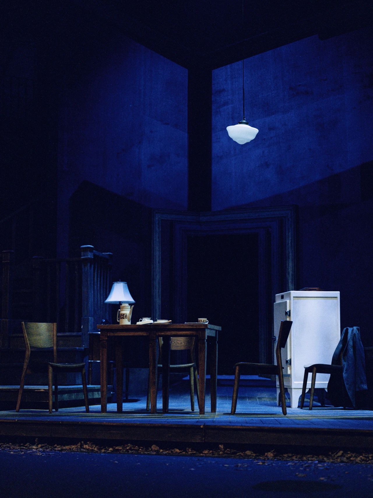 伴随着低音长笛的响起,舞台后方亮起一束光,房子背后和周围环绕着高高耸立、棱角分明的楼房轮廓,遥远天际的蓝光映照在房子上面和舞台前缘,而房子周遭的区域则笼罩在一片带着怒气的橘色光中……