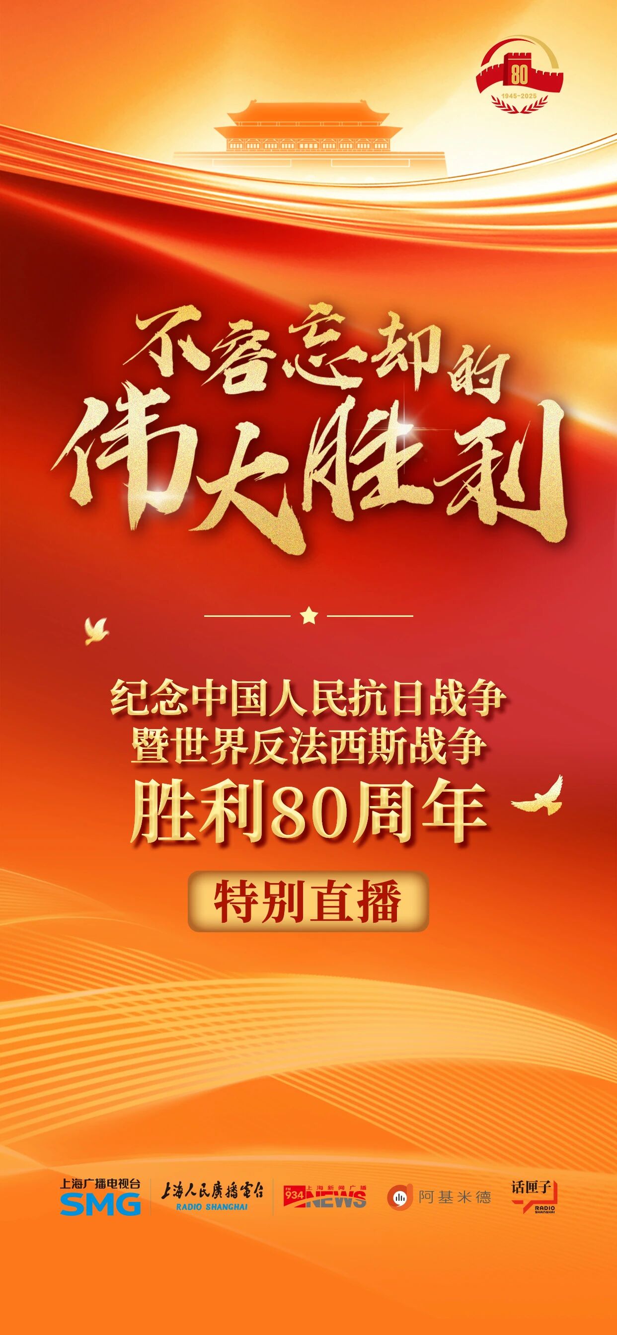 上海广播将推出《不容忘却的伟大胜利》纪念中国人民抗日战争暨世界反法西斯战争胜利80周年特别直播,通过上海新闻广播、阿基米德APP、话匣子矩阵同步音视频直播。特别直播采用“京沪连线”创新形式,全方位展现上海作为“光荣之城”“人民城市”的纪念氛围,弘扬伟大抗战精神,传递和平时代强音。