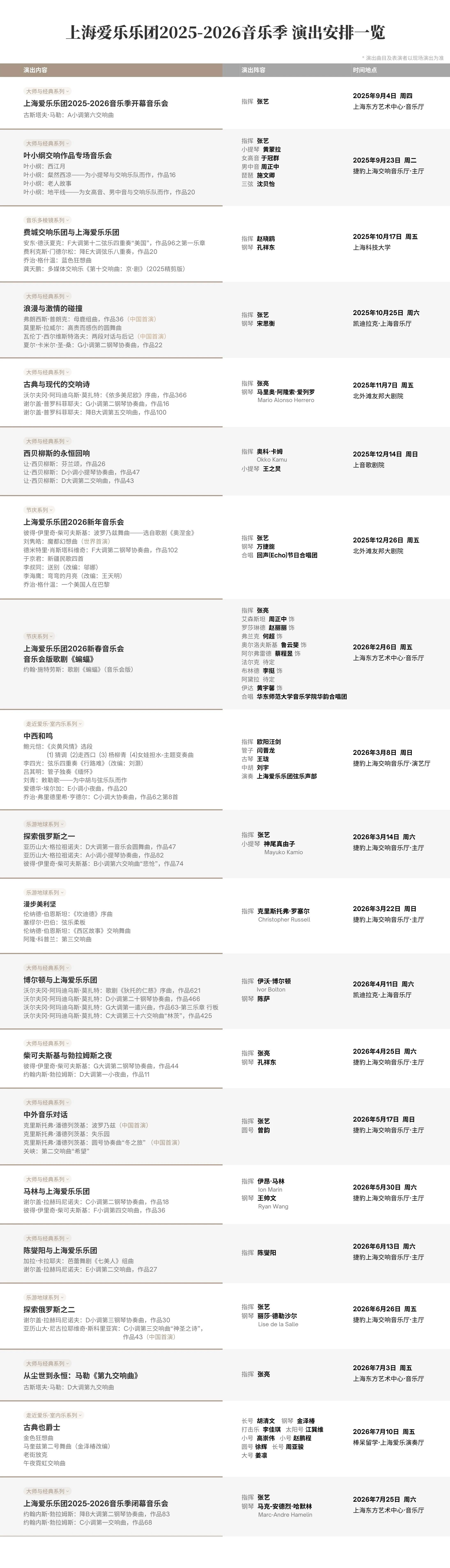20套20场精选音乐会,涵盖大师与经典、乐游地球、音乐多棱镜、节庆、走近爱乐·室内乐等五大系列,旨在构建一个广阔而多元的音乐版图,传承经典同时,探索艺术无限可能。