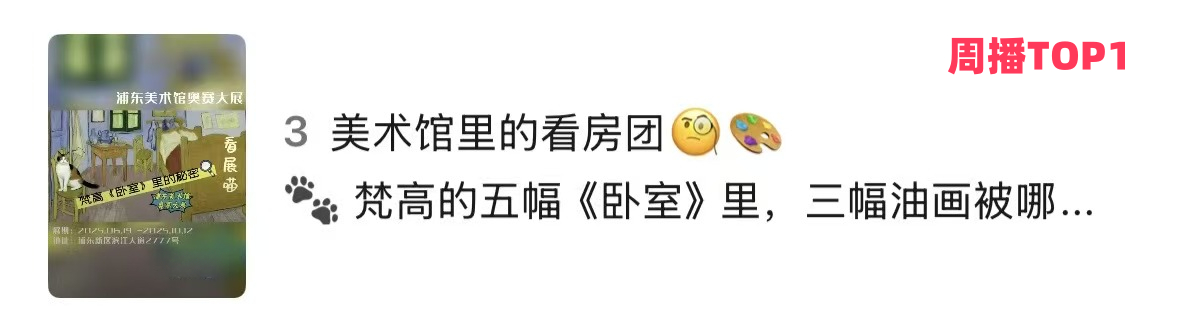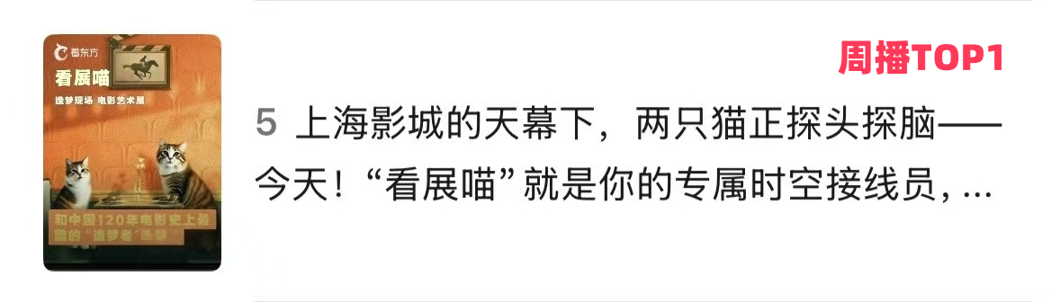 节目开播至今,“看展喵”凭借鲜明风格和优质制作,已逐渐发展成为平台内最受欢迎的文化短视频IP之一。绝大多数单期内容在看东方APP名列前茅,其中更有两期内容凭借用户的高互动和热烈反馈,登顶周播放榜单首位,显示出稳定且持续攀升的用户吸引力。