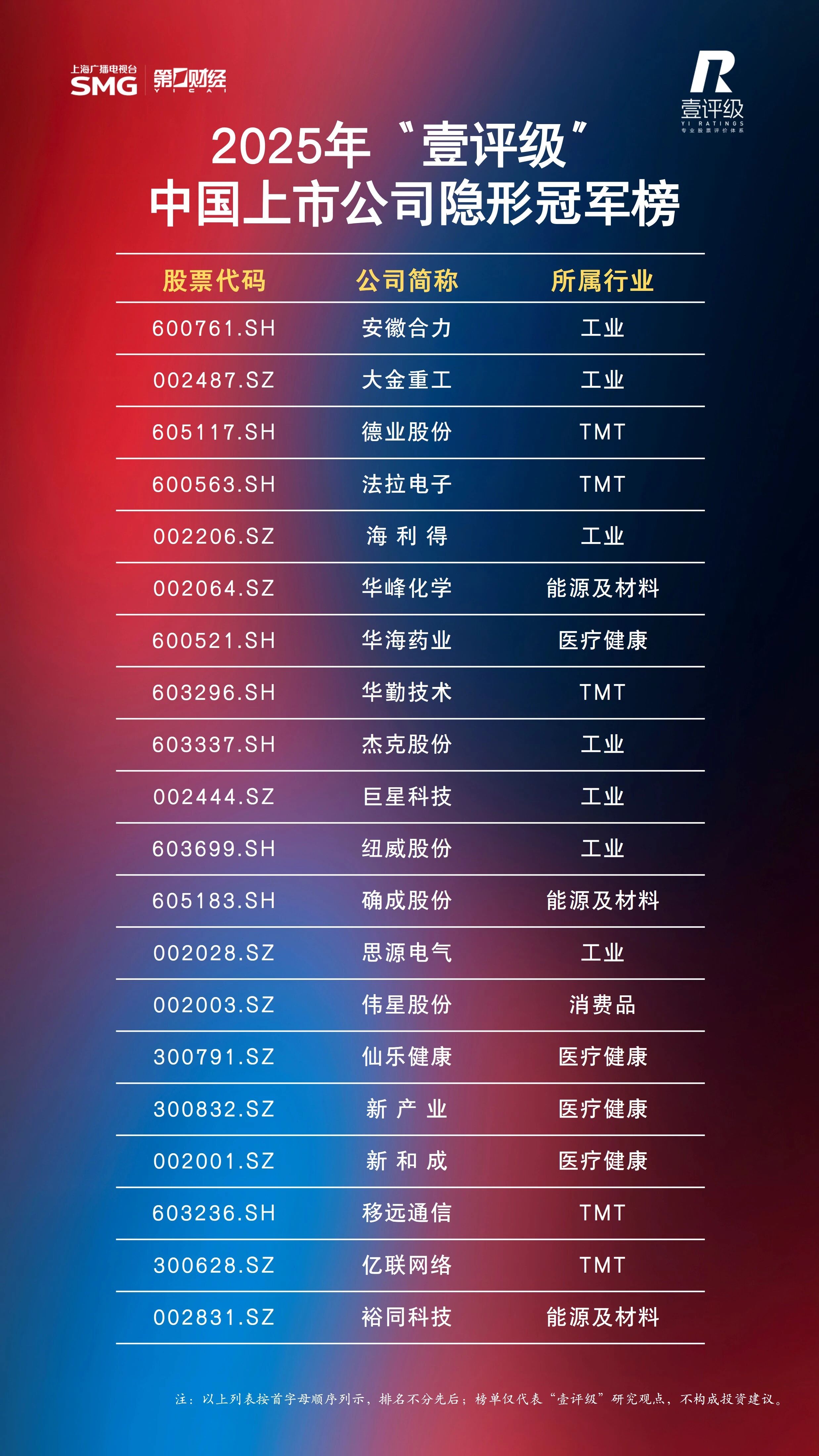 论坛上,第一财经首次发布2025年“壹评级”三大年度榜单,分别是中国上市公司“最具护城河榜”“隐形冠军榜”及“最具价值榜”,同时发布首批上市公司深度研究评级报告。