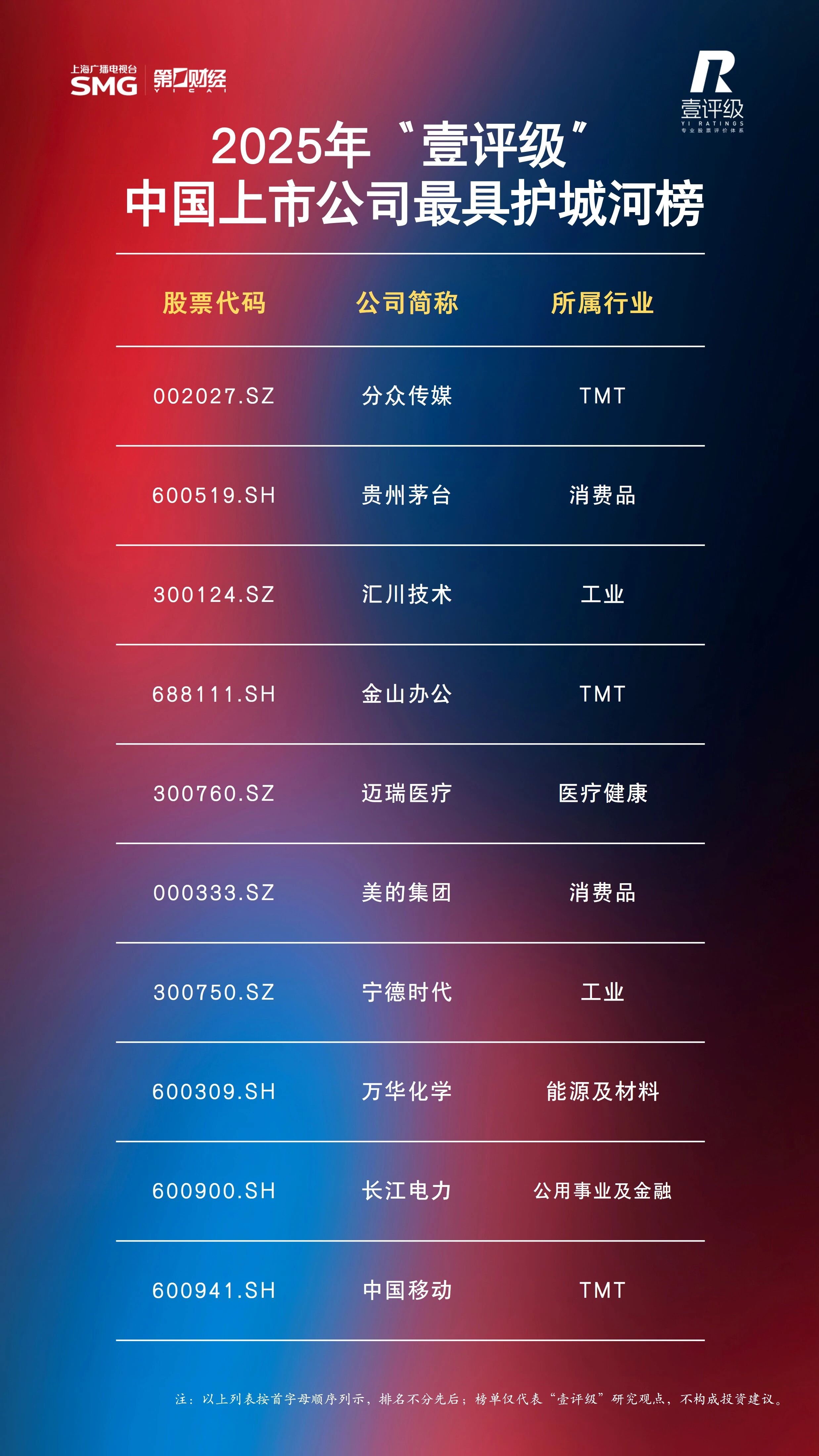 “最具护城河榜”关注企业的持续竞争优势。如何依据不同行业特性找到能够抵御竞争侵蚀的品种,对于投资者而言是取得超额收益的关键,而对企业护城河的评价正是对上市公司长期盈利能力评价的关键。通过四维评级算法模型,“壹评级”在TMT、工业、消费、医疗健康、公用事业及金融、能源及材料六大行业筛选出了10家最具护城河的公司入选榜单。