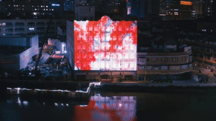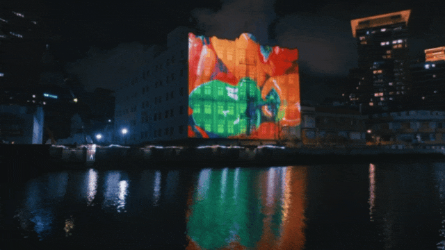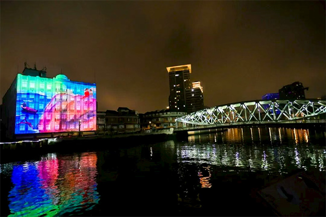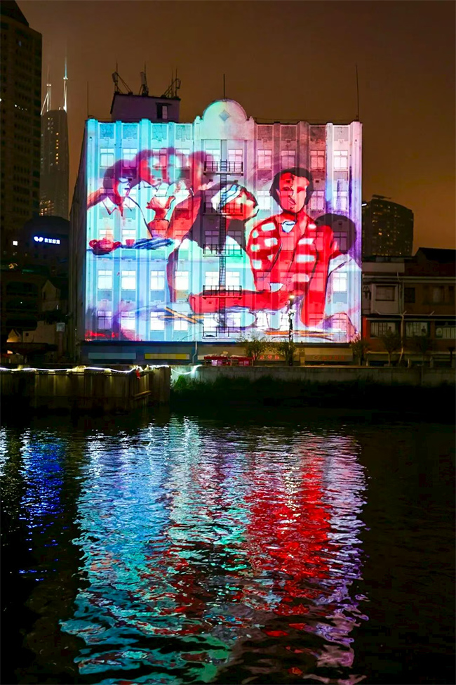 在极具海派文化代表性的苏州河岸,以光影“重生”岭南画派艺术大作,一幅幅色彩鲜艳、生机勃勃的“水墨花园”倒映在温婉的潺潺流水上,形成了奇妙的和谐反差,海派的万千气象与岭南的“折衷中外、融汇古今”精神也在此得以贯通呈现。