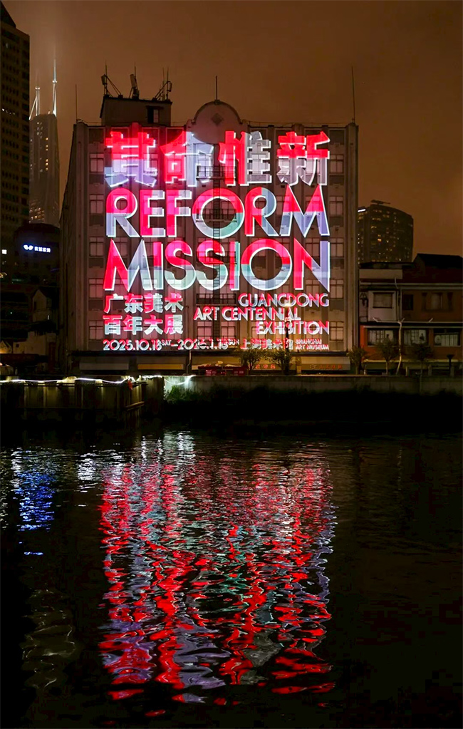 “当岭南遇见海派,不仅是艺术的相遇,更是创新与开放的文化共振。”在第二届上海国际光影节期间,苏州河畔的“闪亮·上海 静安光影季”上演了“其命惟新——广东美术百年大展”光影秀。