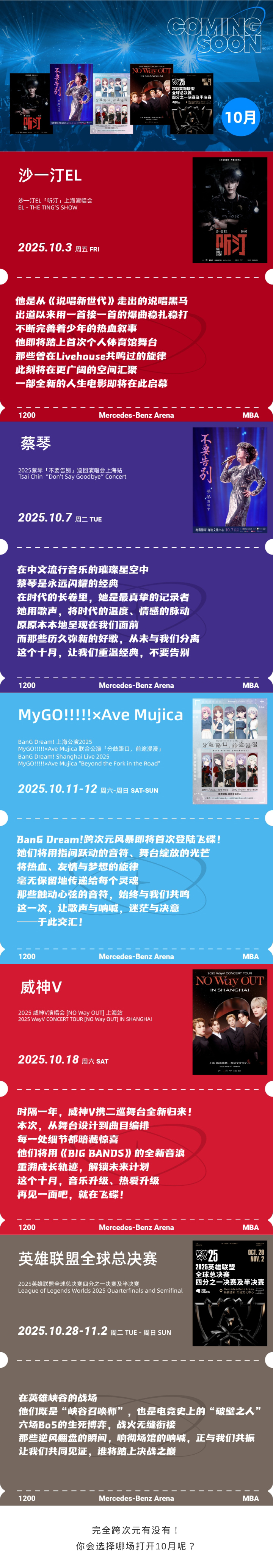 10月的上海演艺精彩不断,东方明珠旗下梅赛德斯-奔驰文化中心迎来多场备受期待的演出与赛事。从沙一汀的热血说唱、蔡琴的隽永金曲,到威神V的炸裂舞台、跨次元乐队BanGDream!的Live震撼,再到英雄联盟S赛的巅峰对决,音乐与电竞在此激情交响,打破所有次元壁。